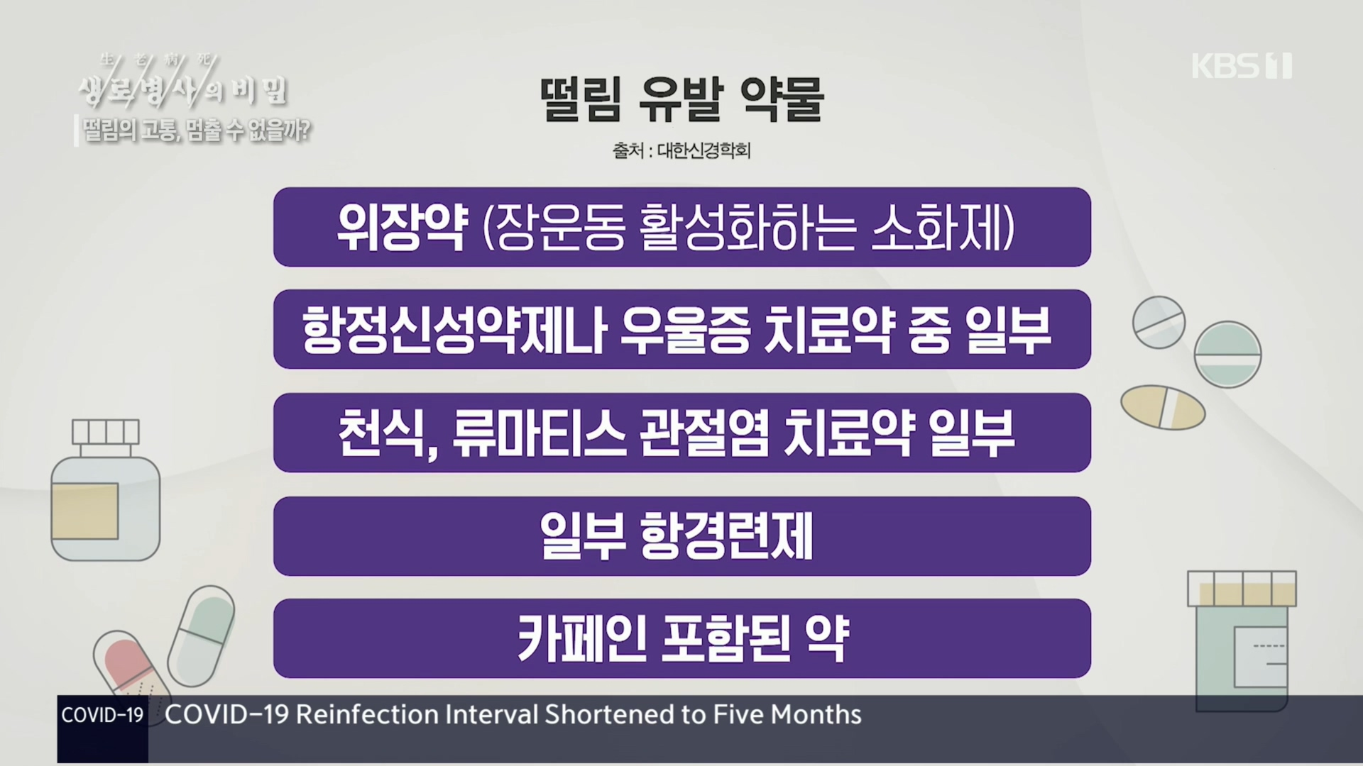 KBS 생로병사의 비밀 842회 [떨림의 고통, 멈출 수 없을까?]방송 일시: 2022.11.9. 수요일 밤 10시 KBS 1TV연출: 김석준 / 작가: 정지영, 김여진 의학적으로 떨림은 몸의 일부가 주기적으로 일정하게 흔