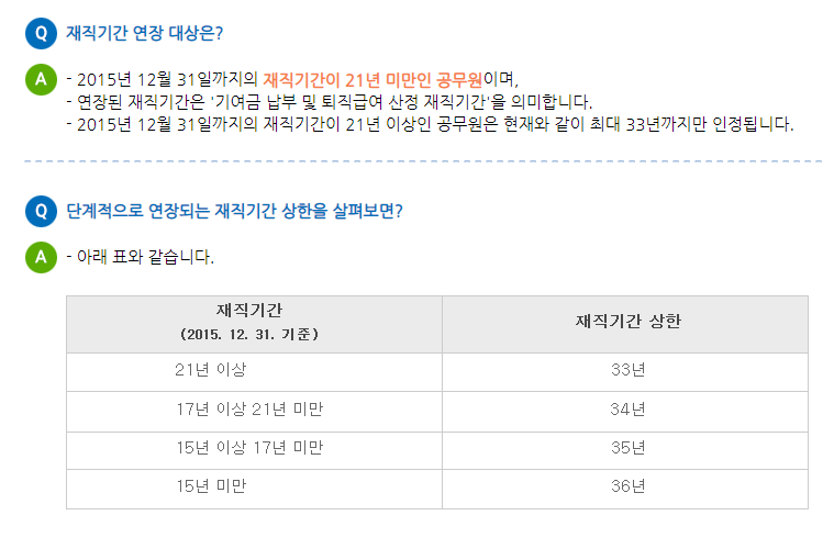 ※ 단계별 적용 : 2015년 12월 31일 기준, 재직기간이 15년 미만은 36년, 17년미만은 35년, 21년 미만은 34년, 21년 이상은 33년