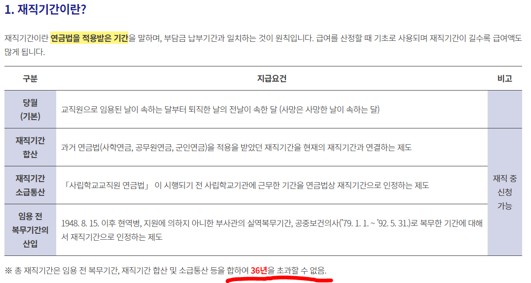 사학연금/공무원연금 최대 재직기간/최소 재직기간(재직기간상한/재직기간하한,납입기간 상한/하한)은? 33년 34년 35년 36년, 연금개시연령? 퇴직즉시? 60세, 61세,62세,63세,64세,65세?
