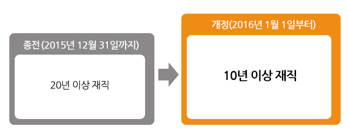 ■ 최소 재직기간(재직기간 하한)은 10년이다. 2016년1월1일 이후. 이전에는 20년이었음.