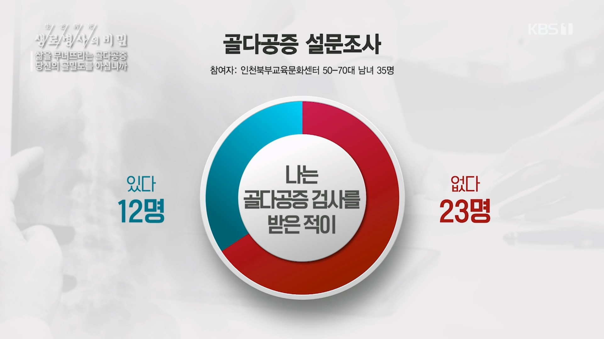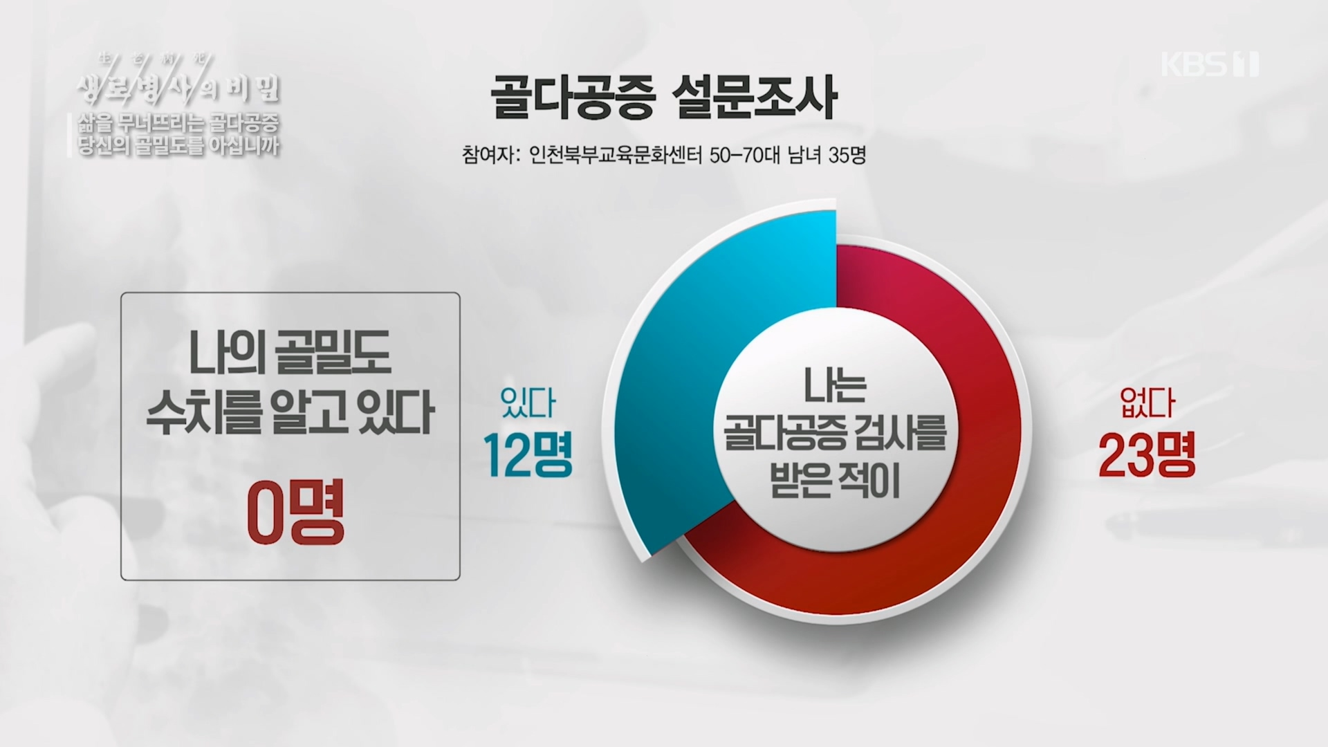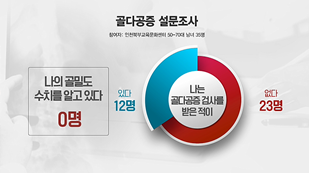 자신의 골밀도를 아는 것은 골다공증의 시작이다. 그렇다면 사람들은 자신의 골밀도를 알고 있을까. 제작진은 50대부터 70대까지 서른다섯 명을 대상으로 설문조사를 실시했다. 그 결과, 조사에 응한 노년층의 절반 이상이 골다공증을 걱정하면서도 정작 관련 검사를 받아본 사람들은 그에 훨씬 미치지 못했고, 검진을 받아본 사람들 중 자신의 골밀도 수치를 알고 있는 사람은 단 한 명도 없었다. 이어서 설문조사에 응한 남녀 10명과 함께 병원을 찾아 골밀도 검사를 진행했다. 그 결과는 어떻게 나타났을까.