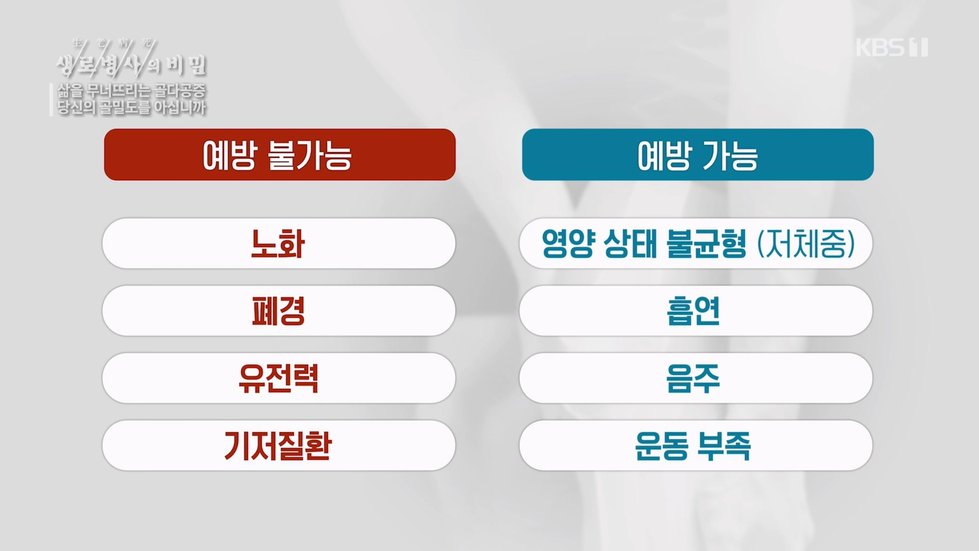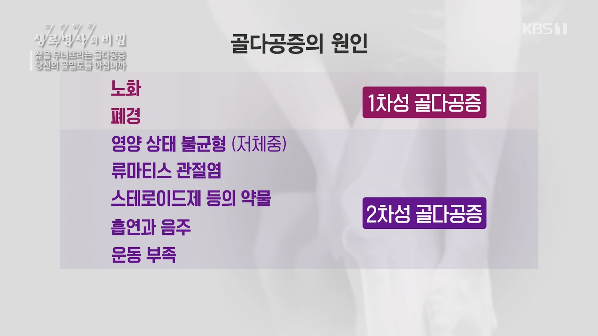2023년 1월 18일 KBS1TV <생/로/병/사/의 비밀> 852회<삶을 무너뜨리는 골다공증, 당신의 골밀도를 아십니까>에서 골다공증의 원인과 예방법을 알아본다!