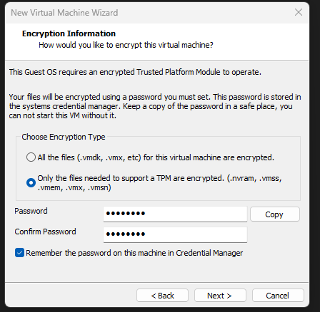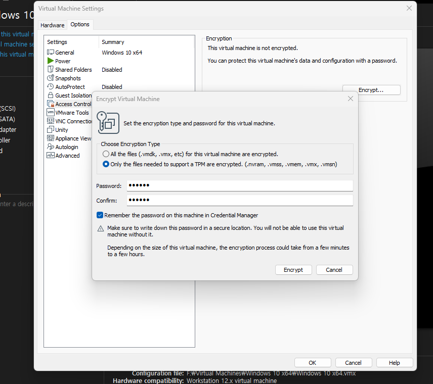 해서... tpm지원되도록 하는 옵션 아래 참조.. VM Setting -> Options -> Access Control -> Encrypt
