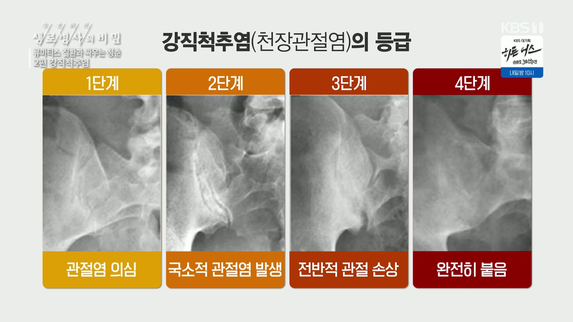 ‘생로병사의 비밀’ ‘류마티스 질환과 싸우는 청춘 특집 2편 - 강직척추염 편에서는 주로 40대 이하의 젊은 남성들의 큰 관절을 공격하는 류마티스 염증성 질병, 강직척추염과 치열하게 싸우는 청춘들의 이야기를 담았다.