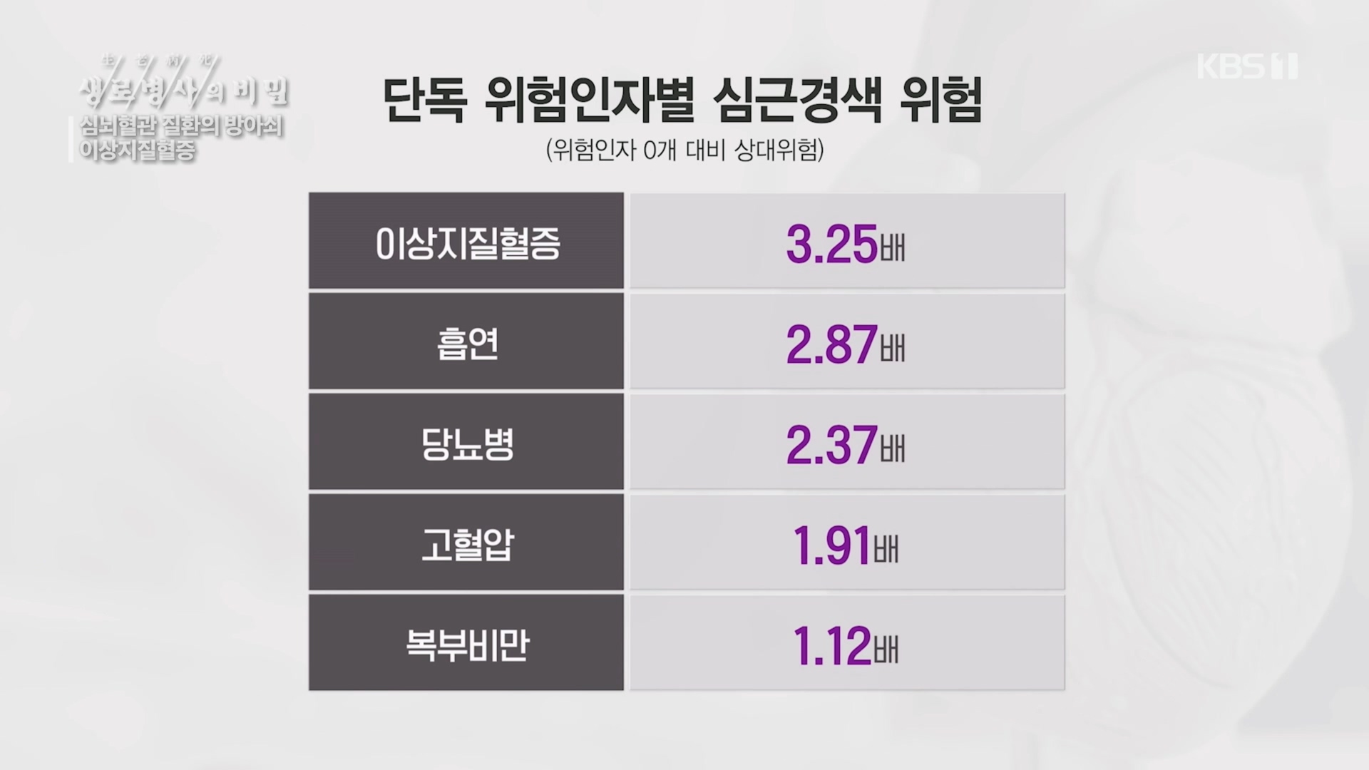 꾸준한 관리가 필요한 이상지질혈증. 뚜렷한 증상이 없어 환자들에겐 관리가 어려운 병이다. 이상지질혈증에서 벗어나 혈관 건강을 되찾을 수 있을까 오는 29일 밤 10시 KBS <생/로/병/사/의/비/밀>에서 파헤쳐 본다.