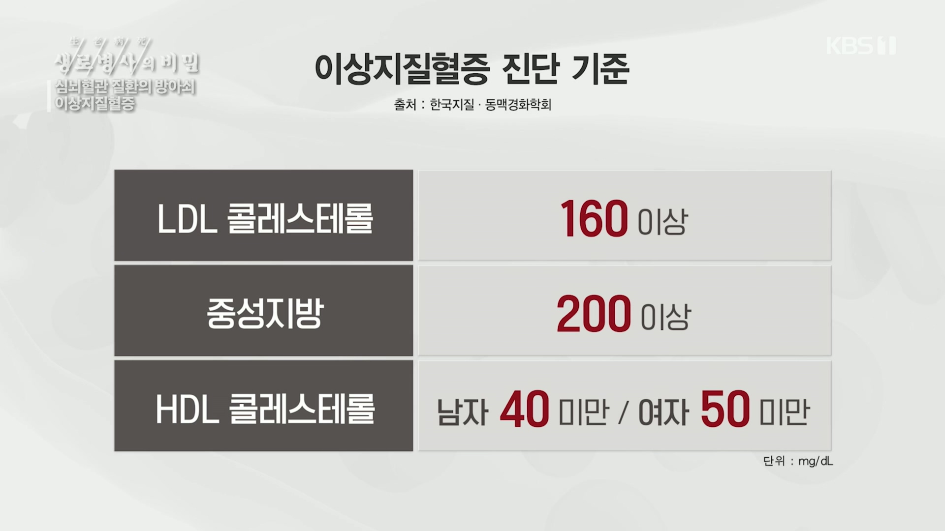 생/로/병/사/의 비밀 혈액도 다이어트가 필요하다 - 고지혈증 ■ 방송 일시 : 2009년 07월 09일 (목) KBS 1TV 22:00~22:50 ■ 담당 프로듀서 : 최기록 PD ■ 작가 : 김경애, 유예진 高 (높을 고), 脂 (기름 지), 血 (피 혈). 혈액 속에 기름의 농도가 높아지는 병. 고지혈증! 우리 몸에 필요한 구성요소로 쓰이는 콜레스.. - 명의.E794.221202.고지혈증, 당신의 LDL 수치는? 명의소개(고대안암병원 순환기내과 홍순준 교수)