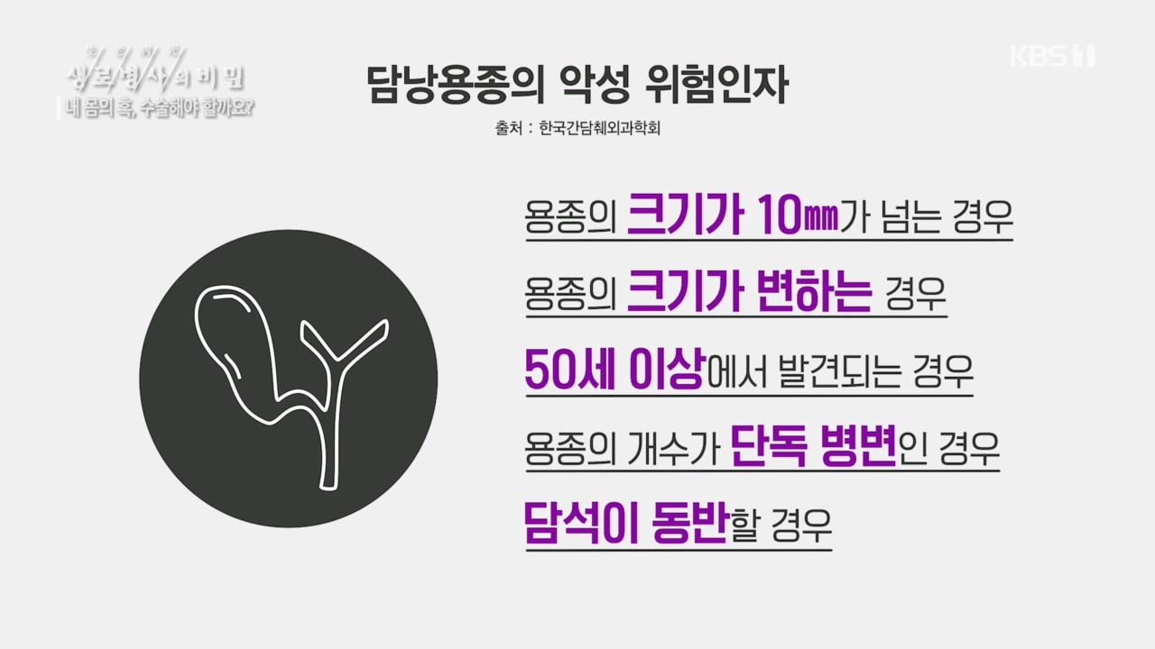 결절을 지켜보기로 한 김숭희 씨와 용종 때문에 담낭 전체를 절제한 박영성 씨. 양성종양이지만 두 사람의 결과를 가른 이유는 무엇일까. 대부분의 양성종양은 증상이 없고 건강에 영향을 주지 않는다. 하지만 양성종양이라도 즉시 떼어야 하거나 조치를 취해야 하는 경우가 있다. 지켜봐도 되는 양성종양은 어떤 것일까, 그렇다면 바로 떼야 하는 양성종양은 어떤 이유에서 없애야 하는 걸까.