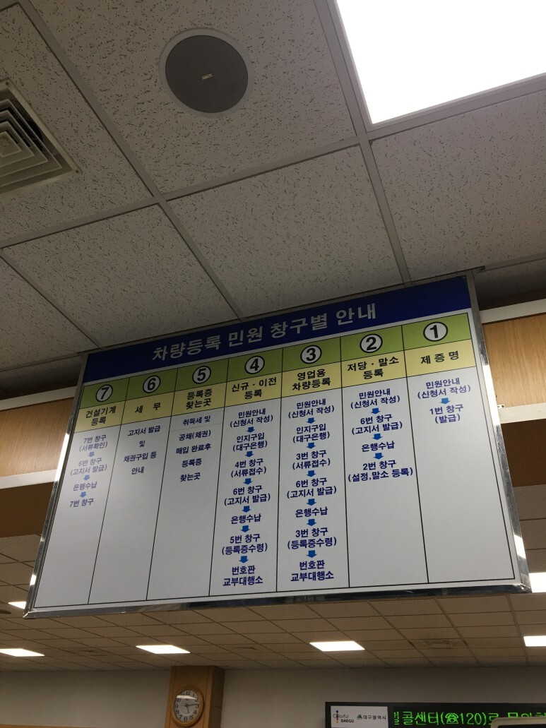 5번창구에 납부영수증 내면 자동차 등록증을 받음.