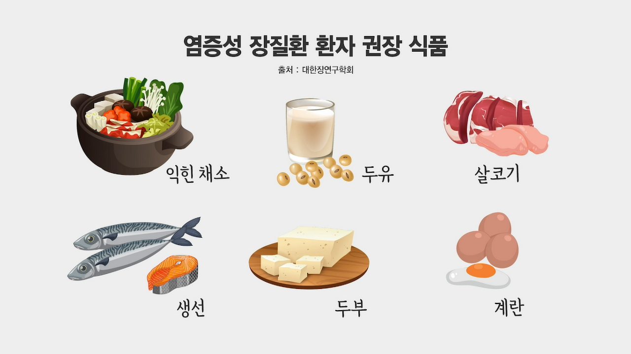 염증성 장질환 환자 권장 식품(출처:대한장연구학회) : 익힌채소, 두유, 살코기, 생선, 두부, 계란