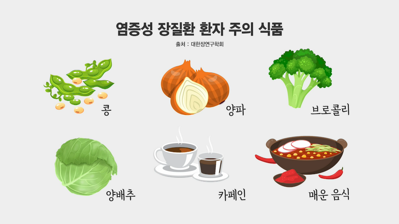 - 염증성 장질환 환자 주의 식품(출처:대한장연구학회) : 콩, 양파, 브로콜리, 양배추, 카페인, 매운음식