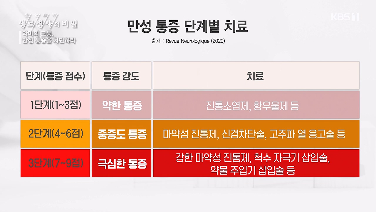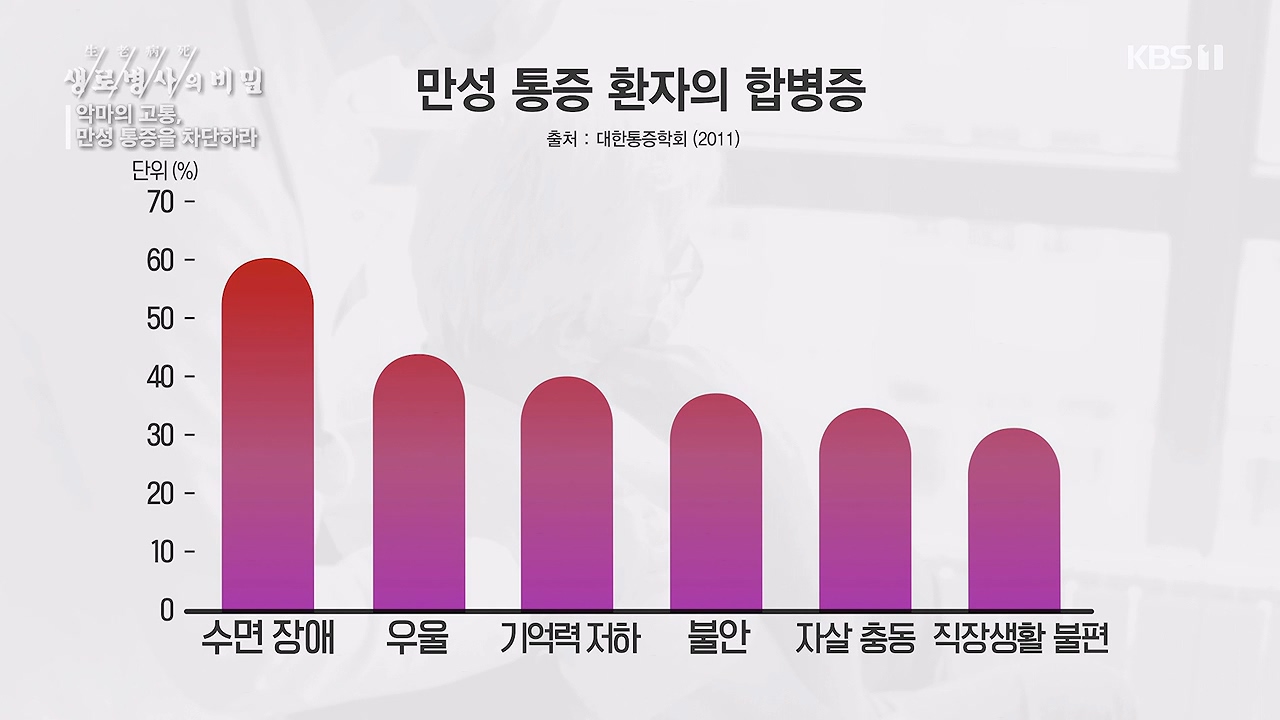 KBS <생로병사의 비밀> 895회[악마의 고통, 만성 통증을 차단하라] - 누구에게나 올 수 있는 질병, 만성 통증… 젊은 층의 발병률도 높다!- 적극적인 치료가 필요한 중증 질환, 최선의 치료법은?통