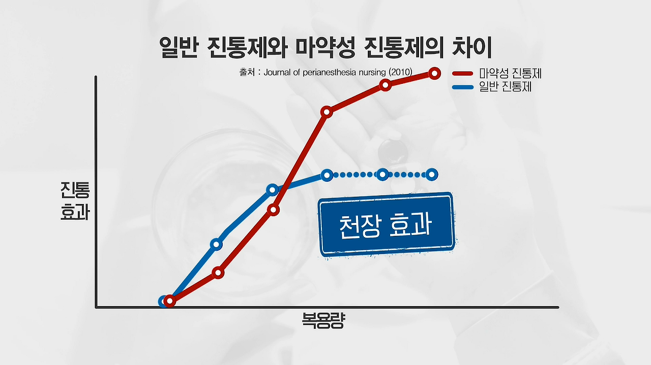 - 일반 진통제와 마약성 진통제의 차이 : 일반진통제는 일정용량 이상 투여해도 천장효과로 더이상 통증억제효과가 없다.