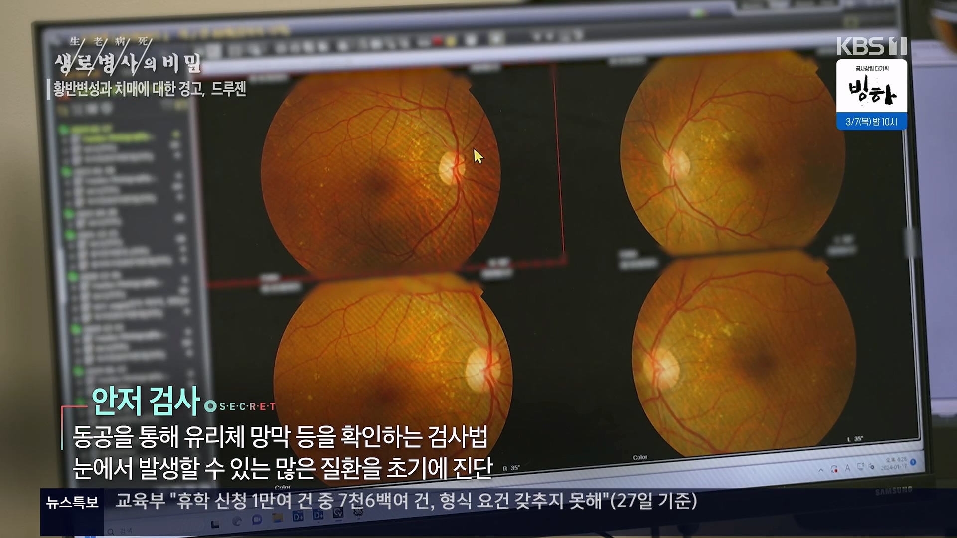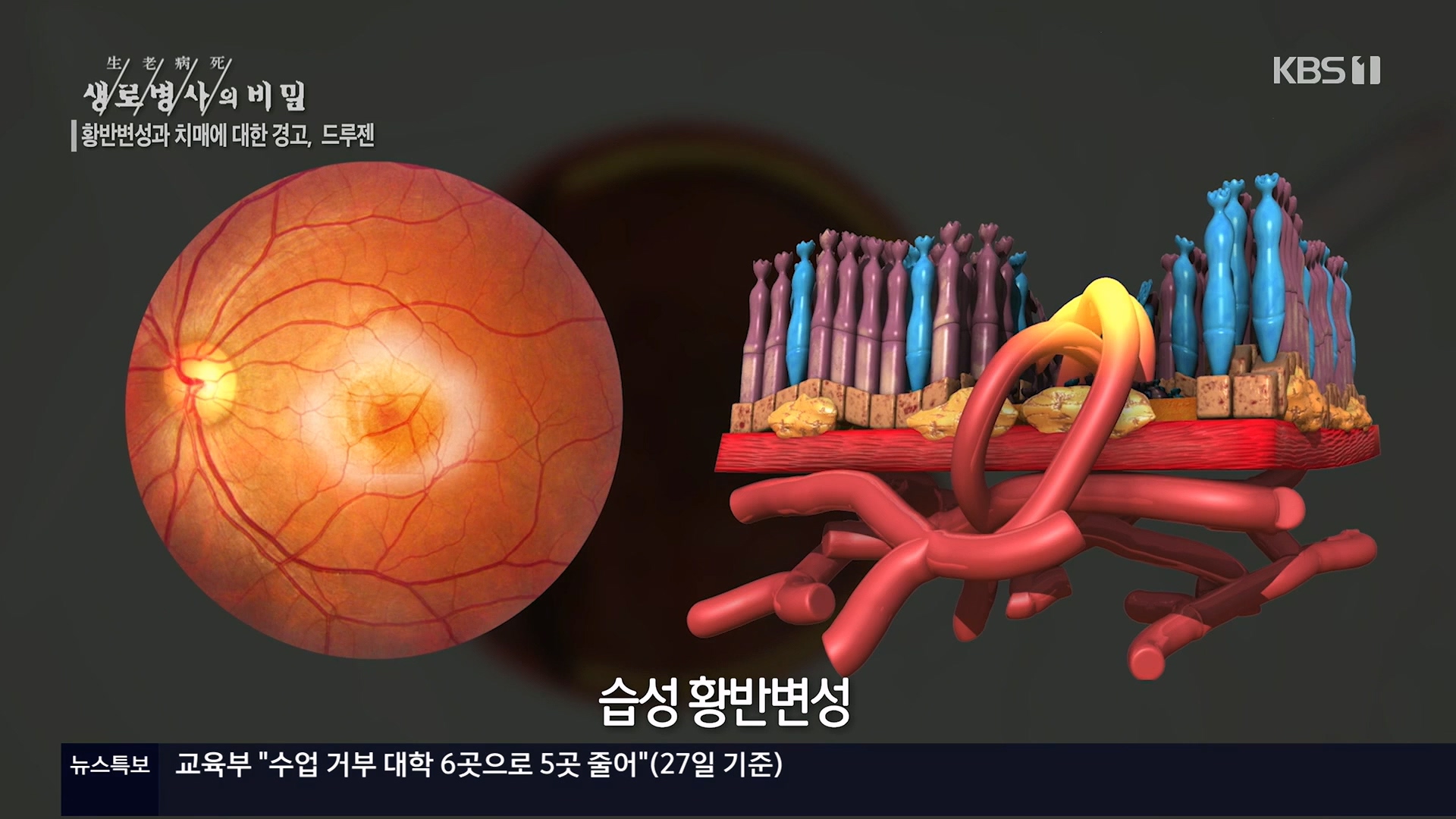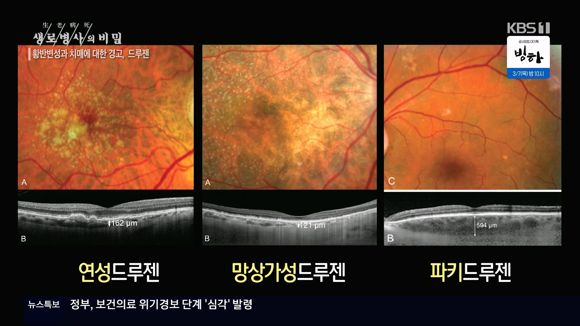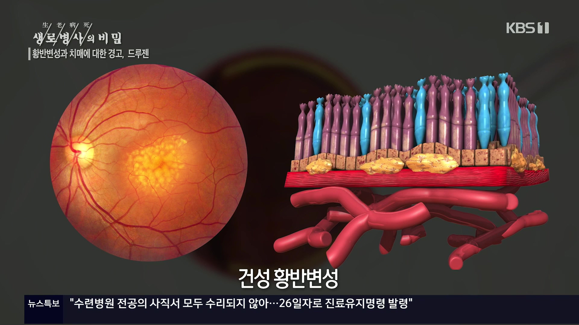 KBS 생로병사의 비밀 899회[황반변성과 치매에 대한 경고, 드루젠]방송 일시 : 2024. 2. 28. 수요일 밤 10시 KBS 1TV연출 : 김동국 / 작가 : 손희숙실명을 초래하는 3대 질환인 녹내장, 당뇨망막병증, 황반