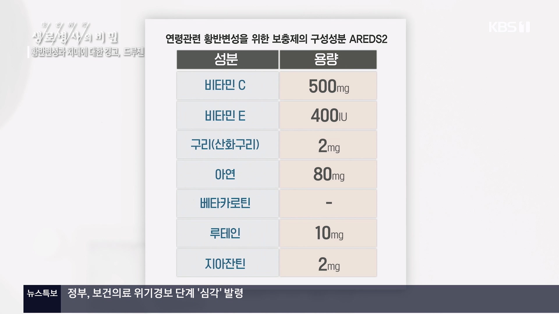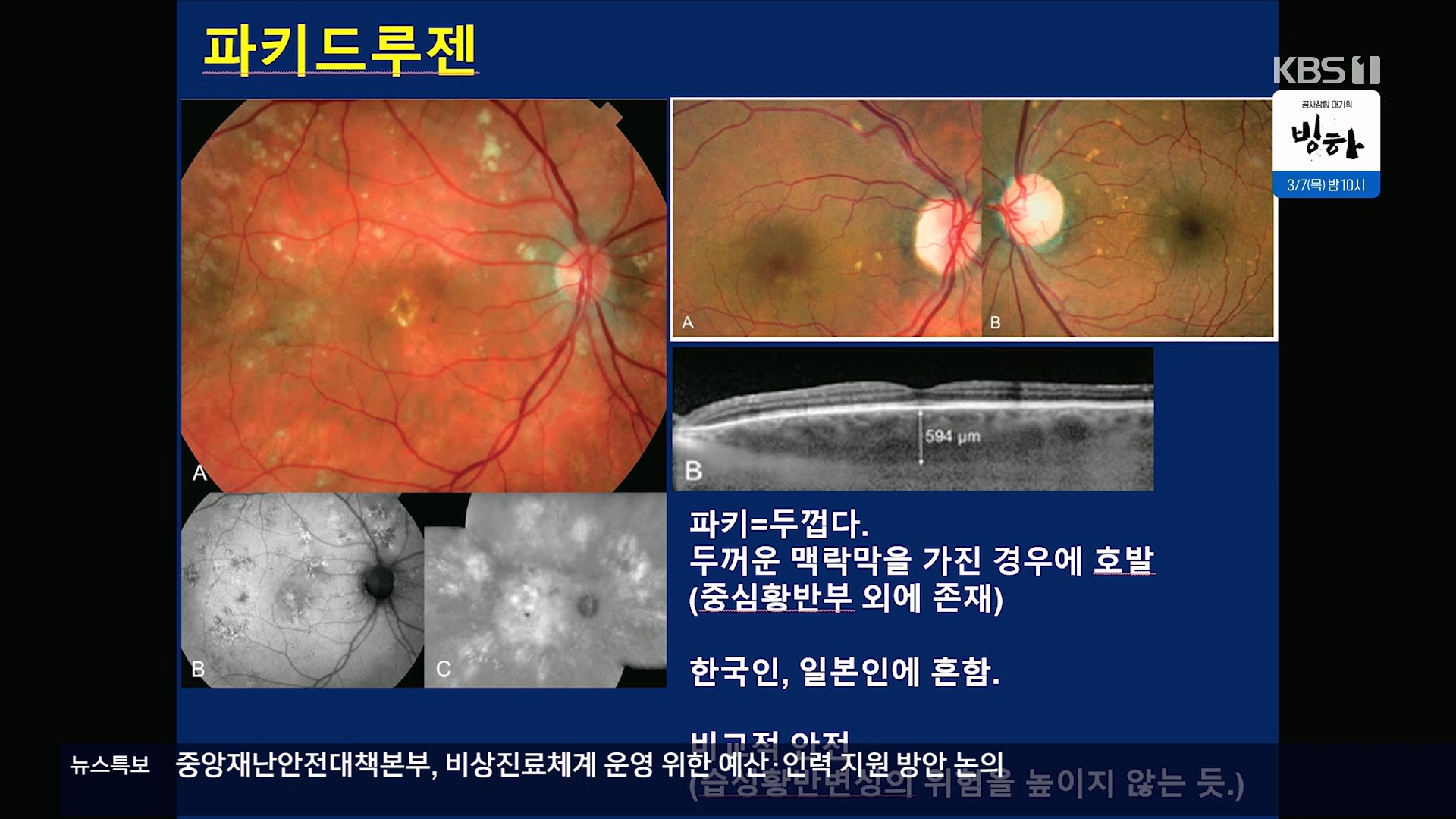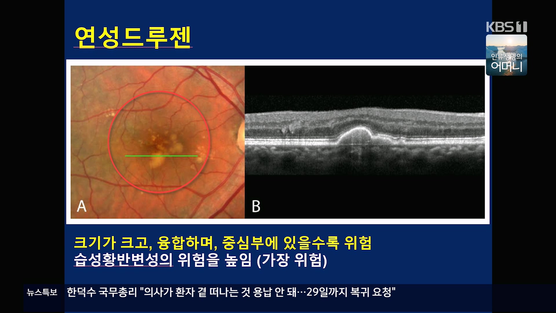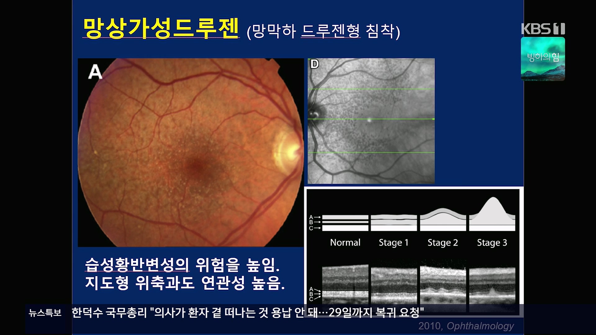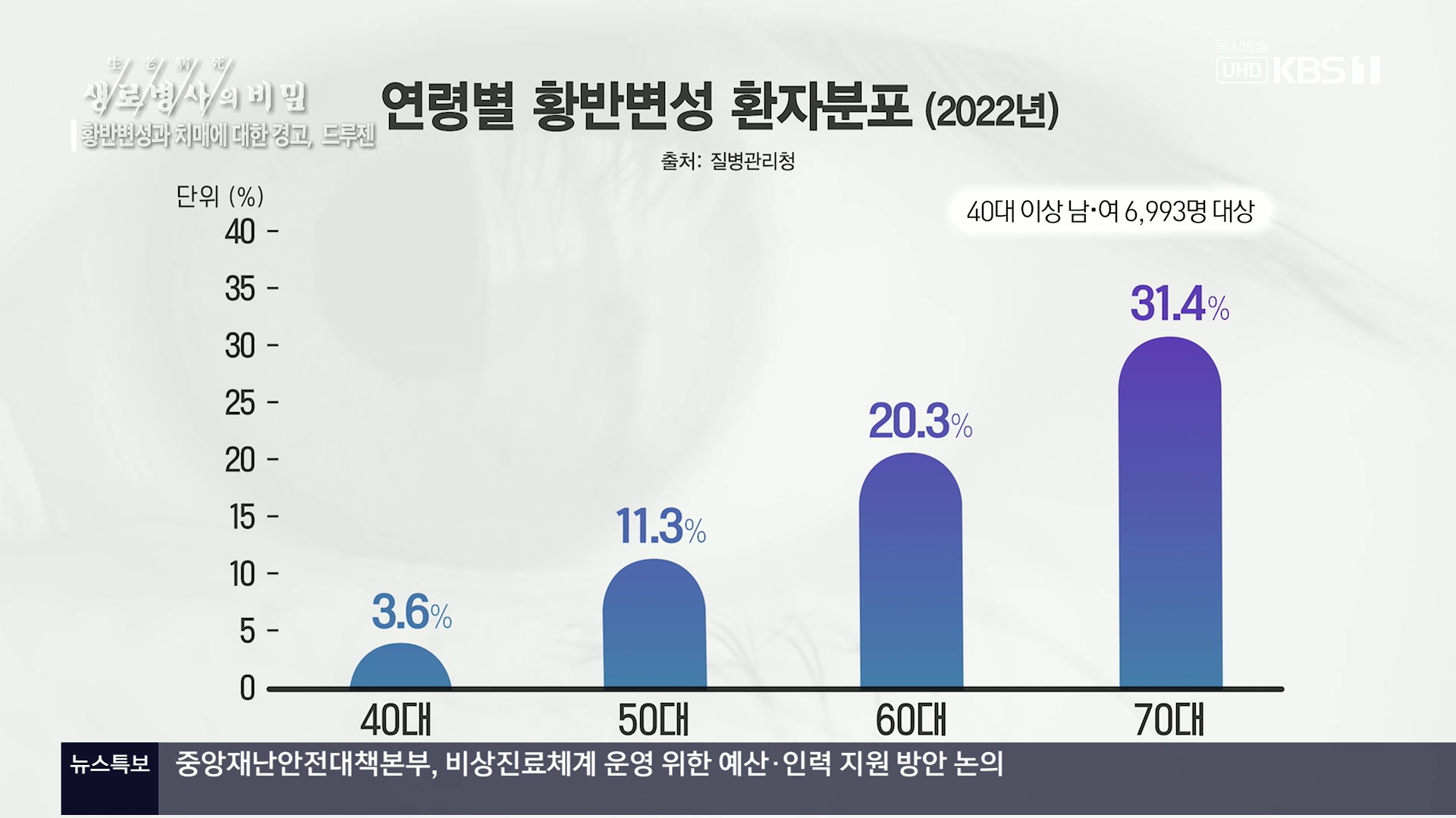 KBS 생로병사의 비밀 899회[황반변성과 치매에 대한 경고, 드루젠]방송 일시 : 2024. 2. 28. 수요일 밤 10시 KBS 1TV연출 : 김동국 / 작가 : 손희숙실명을 초래하는 3대 질환인 녹내장, 당뇨망막병증, 황반