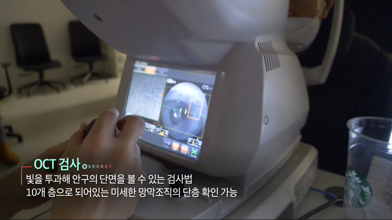 - OCT검사 : 빛을 투과해 안구의 단면을 볼 수 있는 검사법 10개 층으로 되어 있는 미세한 망막조직읟 단층 확인 가능