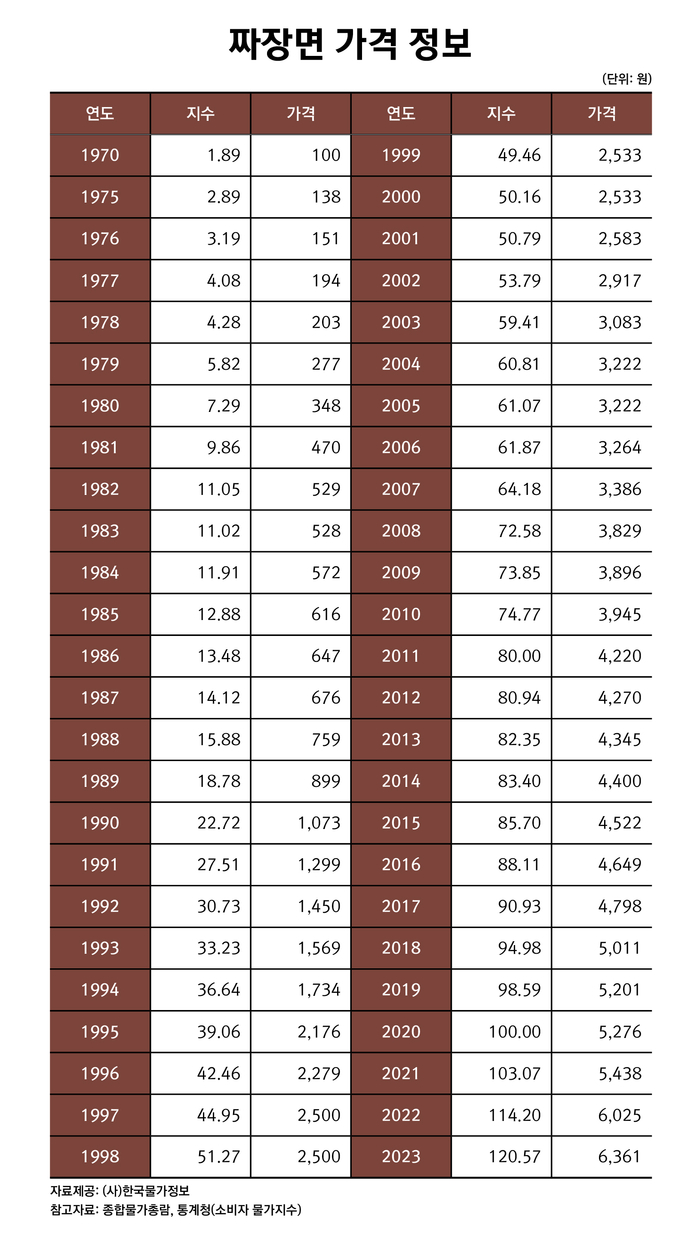 1970년부터 2023년 까지의 짜장면 가격