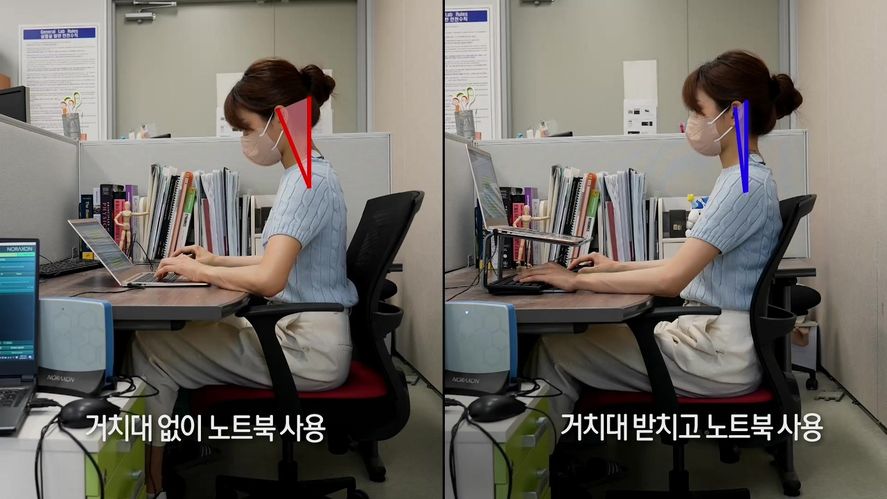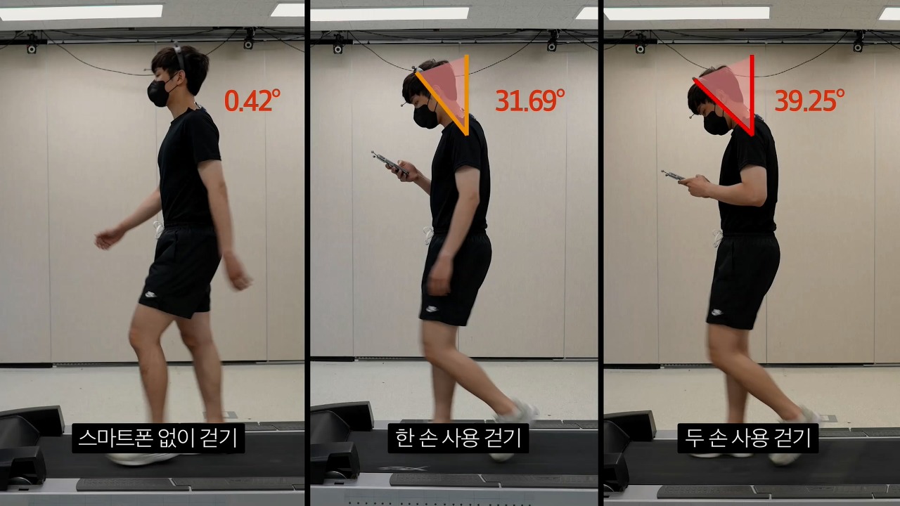 그렇다면 올바른 각도란 무엇일까? 서울대학교 산업공학과 윤명환 교수의 연구에 따르면 앉은 자세에 따라 몸에 가해지는 압력에 차이가 나고 이러한 압력에 의해 등과 골반 등이 영향을 받는다. 또한 울산과학기술원 인간공학과 신관섭 교수 연구팀은 요즘 이동 중에도 고개를 푹 숙인 채 스마트 폰에 열중하는 사람들에 착안, 걸어 다니면서 스마트 폰을 사용할 때 머리를 어느 정도 숙이는지 실험했다. 스마트 폰 사용은 과연 우리의 목 근육과 관절에 어떤 영향을 끼치는 걸까.