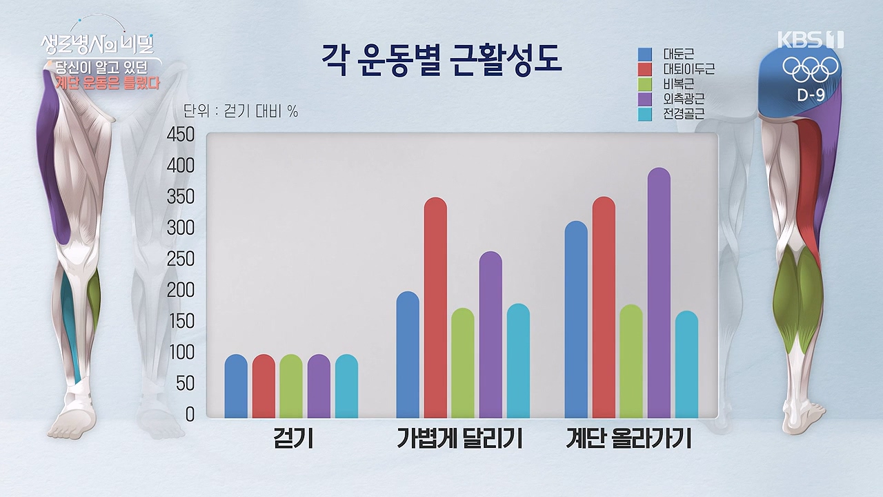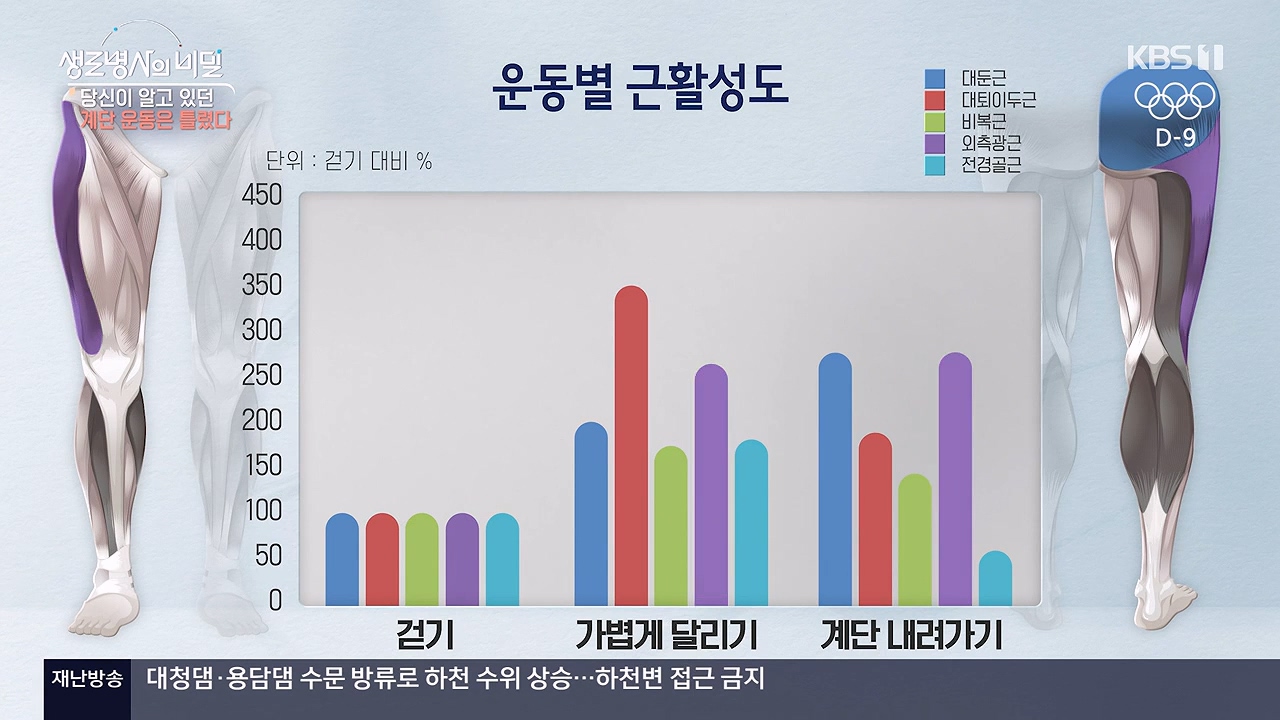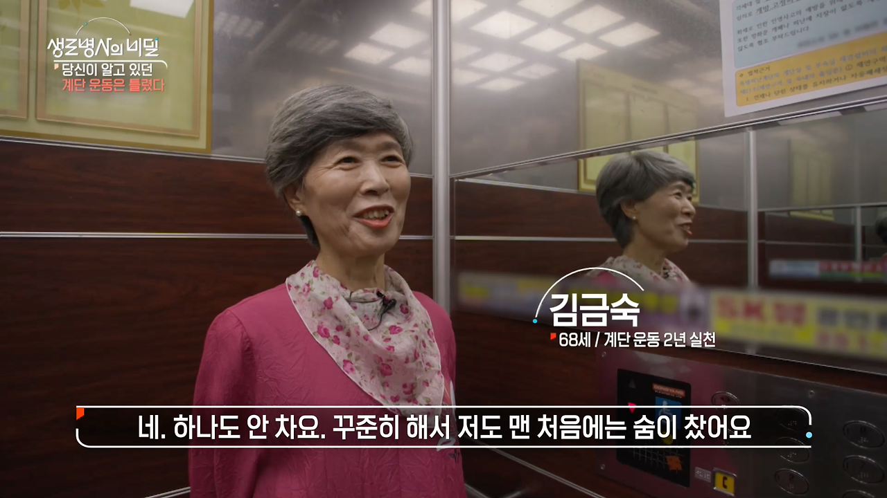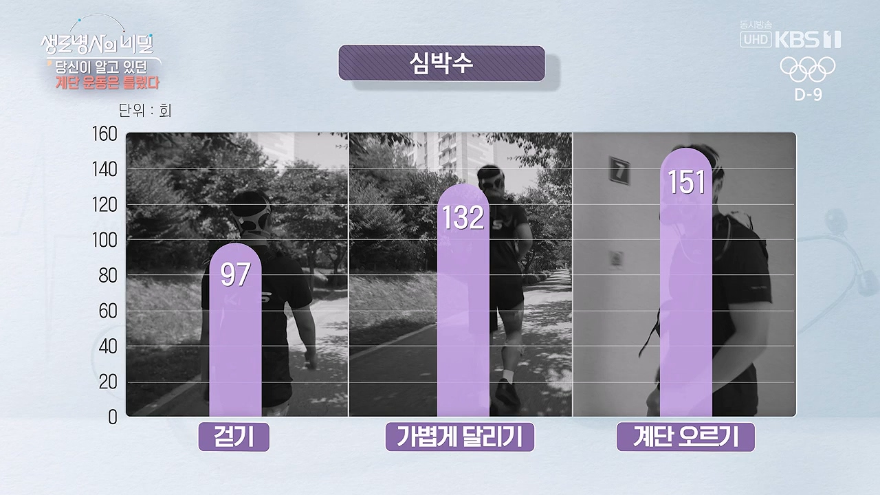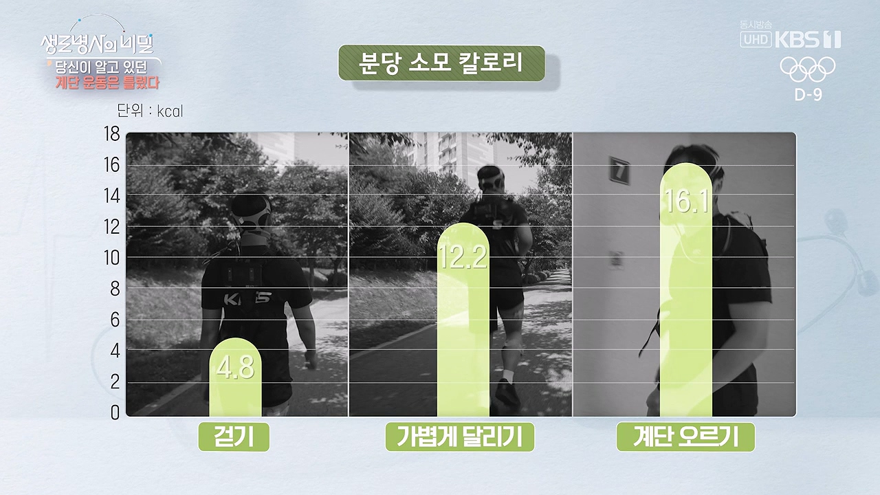 생로병사의 비밀당신이 알고 있던 계단 운동은 틀렸다 * 방송일시 : 2024. 7. 17. (수) 밤 10시 KBS 1TV* 연출: 안진 * 작가: 조용오, 이가람, 최윤지계단 운동이 심폐지구력 강화, 체중 감량, 근력 강화