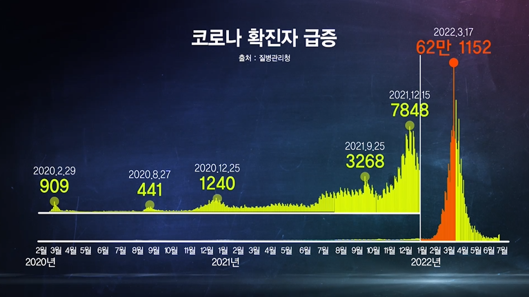 2022년 7월 현재, 거리에는 마스크를 벗고 다니는 사람들로 가득하지만, 확진자 그래프는 다시 상승곡선을 타기 시작했다. 변이 바이러스 ‘BA.5’가 등장했고 정부는 코로나 재유행을 공식 선언하며 사회적 거리 두기 변경을 검토 중이다.
