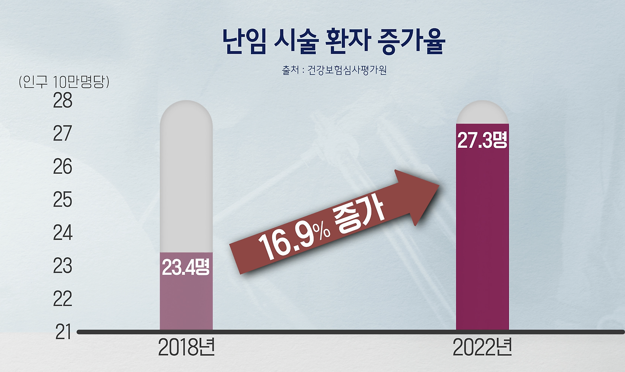 - 난임 시술 환자 증가율 (출처: 건강보험심사평가원) 인구10만명단 2018년 23.4명 => 2022년 27.3명 16.9% 증가