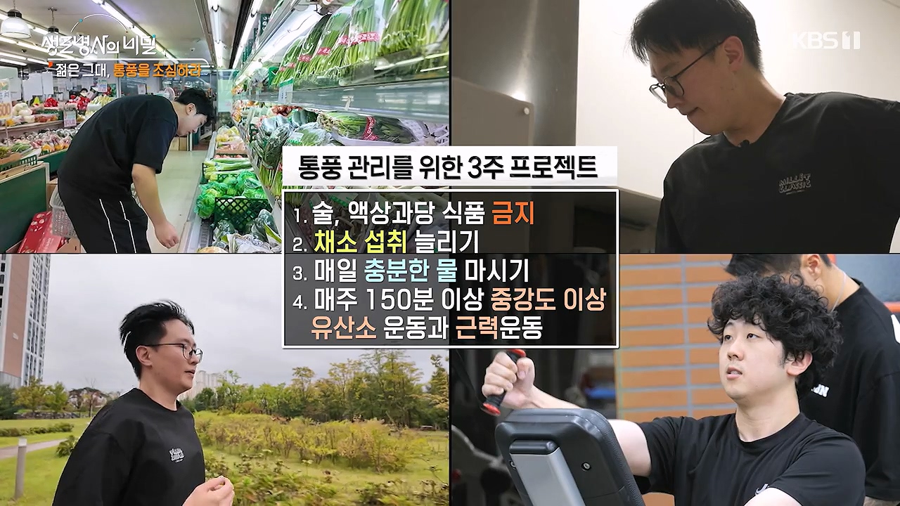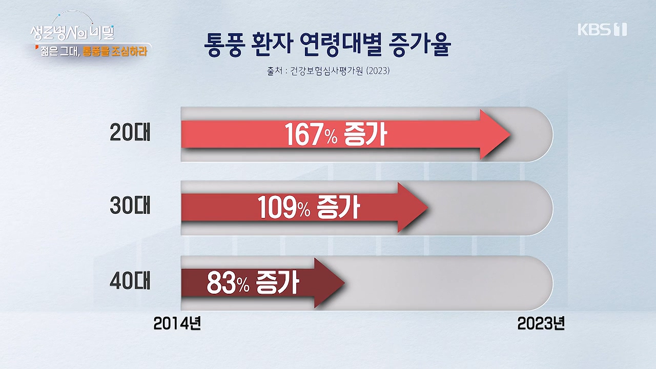 젊은 그대, 통풍을 조심하라방송 일시: 2024. 11. 6 수요일 밤 10시 KBS 1TV연출: 이명선 / 작가: 강유정, 신민지바람만 스쳐도 수십 개의 칼날이 찌르는 것 같은 통증을 느낀다는 통풍. 2023년 기준 통
