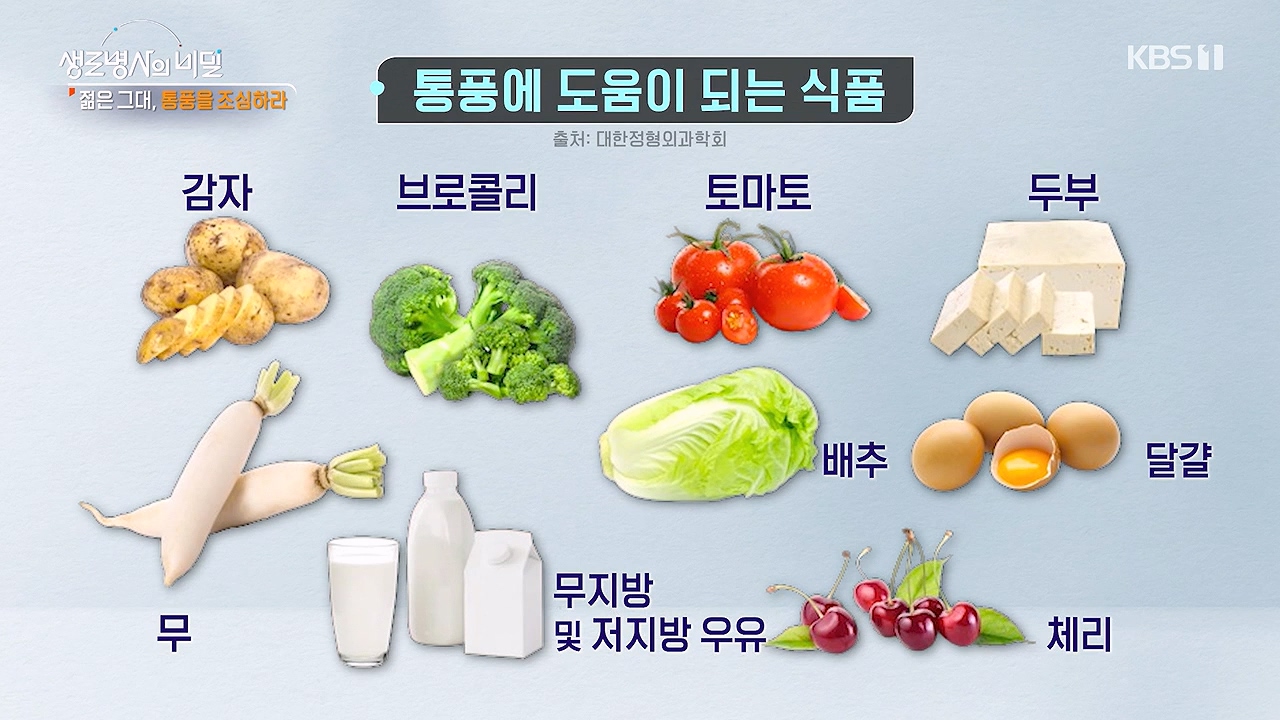 통풍에 도움되는 식품 (출처:대한정형외과 학회) : 감자, 블로콜리, 토마토, 두부, 무, 무지방 및 저지방우유,배추,달걀,체리