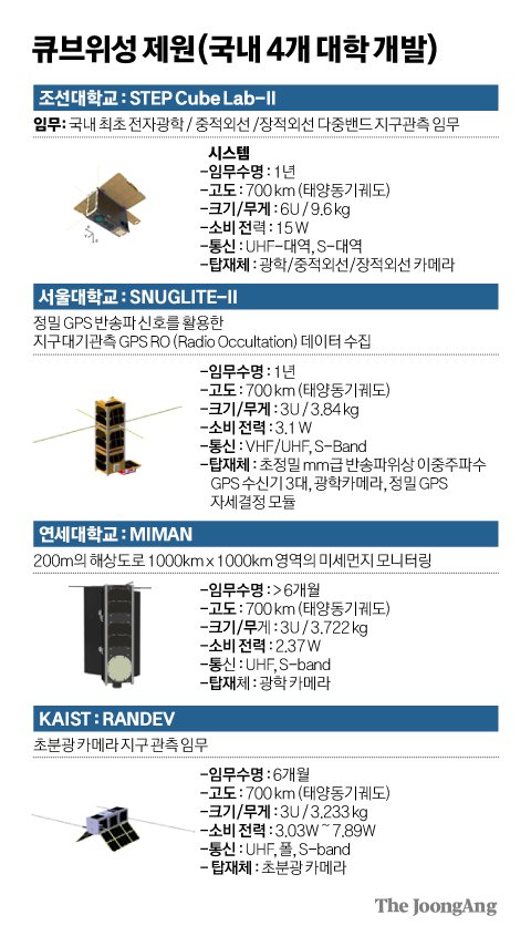 6개 팀은 고급위성 분야의 조선대팀(팀명 Cosmic Light house Keeper 박설현 기계공학과 교수팀)·서울대팀(팀명 SNUGLITE), 기초위성 분야의 세종대팀(팀명 SUNRISE)·인하대팀(팀명 InCuPion 항공우주공학과 최기영 교수 연구팀)·KAIST팀(팀명 GBSAT, K-HERO) 등이다.