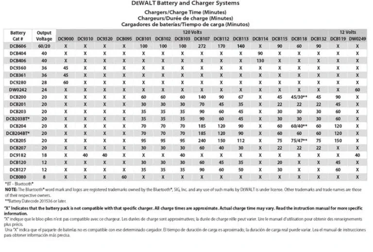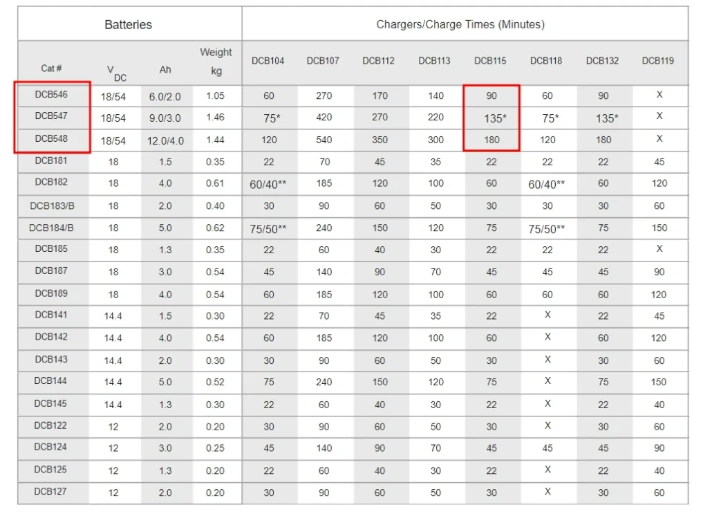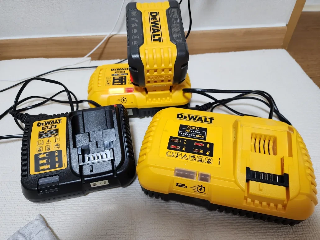 위 표에 보시면 DCB546이 현재 DCB606이고 DCB547이 DCB609이며 DCB548이 DCB612입니다. 기존에는 18V로 표기되던 제품들이 몇년전 리뉴얼되면서 20V로 바뀌었고 54V로 표기된 제품군들은 현재 60V 제품입니다. DCB104, DCB107, DCB112, DCB113, DCB115, DCB132는 모든 12V-60V의 모든 디월트 제품군의 충전이 가능합니다. 다만 전 제품 충전가능한 제품들 중 DCB104를 제외한 모든 충전기는 속도가 빠르지 않기에 60V 제품 충전하는데 꽤나 많은 시간이 소요됩니다. 그래서 전 4A 속도로 충전가능한 DCB115 충전기에는 DCBP034 파워스택(Powerstack) 1.7Ah 배터리만 충전하고 그외에는 고속 충전기 가능한 DCB117, DCB118을 선호합니다.