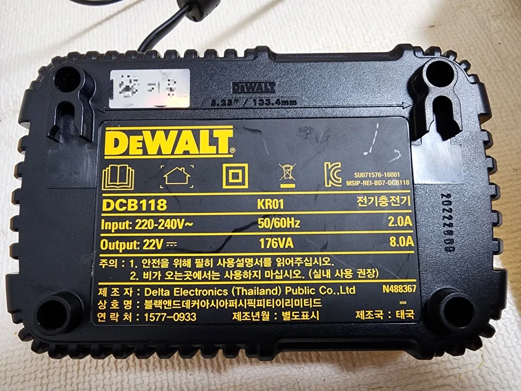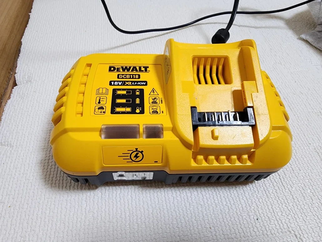 디월트 충전기중 고속 충전기에 해당하는 DCB118입니다. 8A의 속도로 충전이 가능하며 빠른 속도로 충전이 가능한 만큼 열이 많이 발생하기에 쿨링팬이 있어서 충전기 소음이 상당히 있습니다. 일반가정에서 충전하신다면 많이 거슬릴 수 있으나 일반적인 현장에서 사용하기에는 큰 소음은 아니라고 생각됩니다. 그나저나 아이 이름 스티커 주물할때 같이 주문한 제 이름이 적힌 스티커가 붙어있어서 좀 챙피합니다. 하지만 현장에선 니꺼내꺼가 없기에 매직으로 표기를 하던 스티커를 붙이던지 해서 구분을 해놔야합니다.