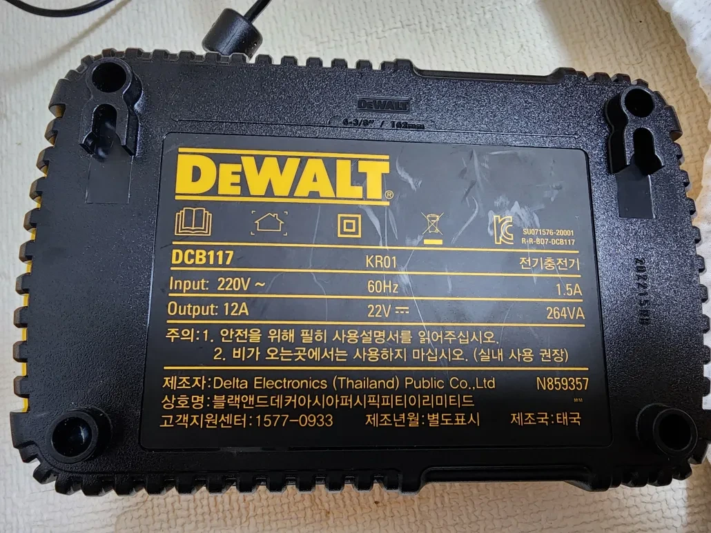 디월트 DCB117 고속 충전기는 디월트에서 가장빠른 12A 제품인 만큼 20V기준으로 9Ah인(60V시 3Ah) DCB609를 단 60분만에 완충이 가능합니다. 그만큼 팬이 돌아가는 소리도 상당합니다. DCB118과 마찬가지로 12V(10.8V)제품은 충전이 불가합니다. 눈여겨 보실 부분이 있는데 DCB118과는 20V 배터리 제품의 충전속도가 동일하며 60V제품에서만 차이가 납니다. 그리고 4A 제품인 DCB115와도 DCB204(DCB182신형), DCB205( DCB184신형) 외에는 속도차이가 나지 않습니다. 디월트 60V 충전공구를 사용하시는 분이시라면 가격이 어마어마한 4포트짜리 DCB104는 아니더라도 DCB118이나 DCB117을 추천합니다. 이상 디월트 충전기 3종의 짧은 리뷰 였습니다.