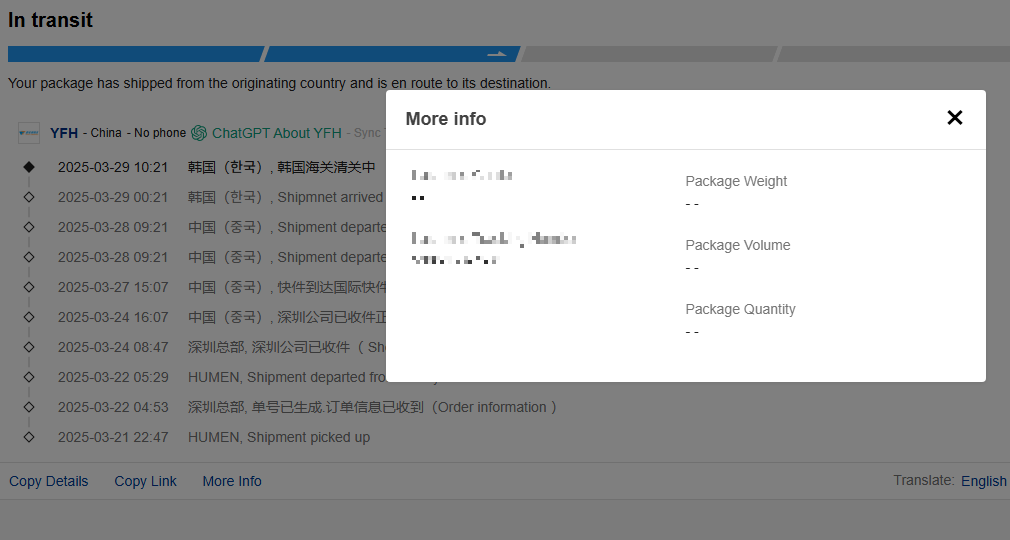 와같이 조회후 More Info 를 누르면 아래와 같이 Last-mile Tracking Number가 조회되는데, 이 번호가 국내 송장번호 되시겠다.