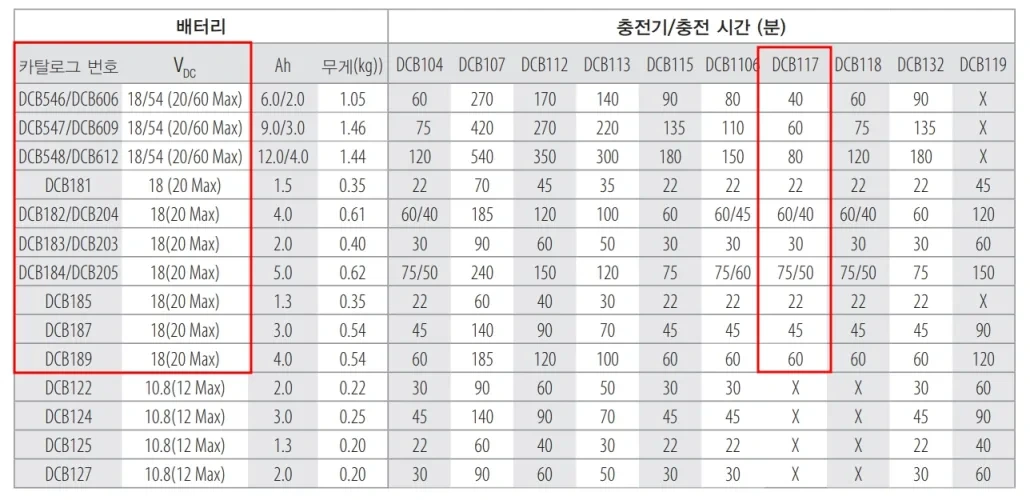| 충전 속도 | 4.0Ah 기준 약 1시간 | 6.0Ah 기준 약 1시간 | 9.0Ah 기준 약 1시간 (60v-3A, 20v-9.0A) 60v제품만 dcb118에 비해서 빠른편이다. 20V 제품은 차이없다고 함. |