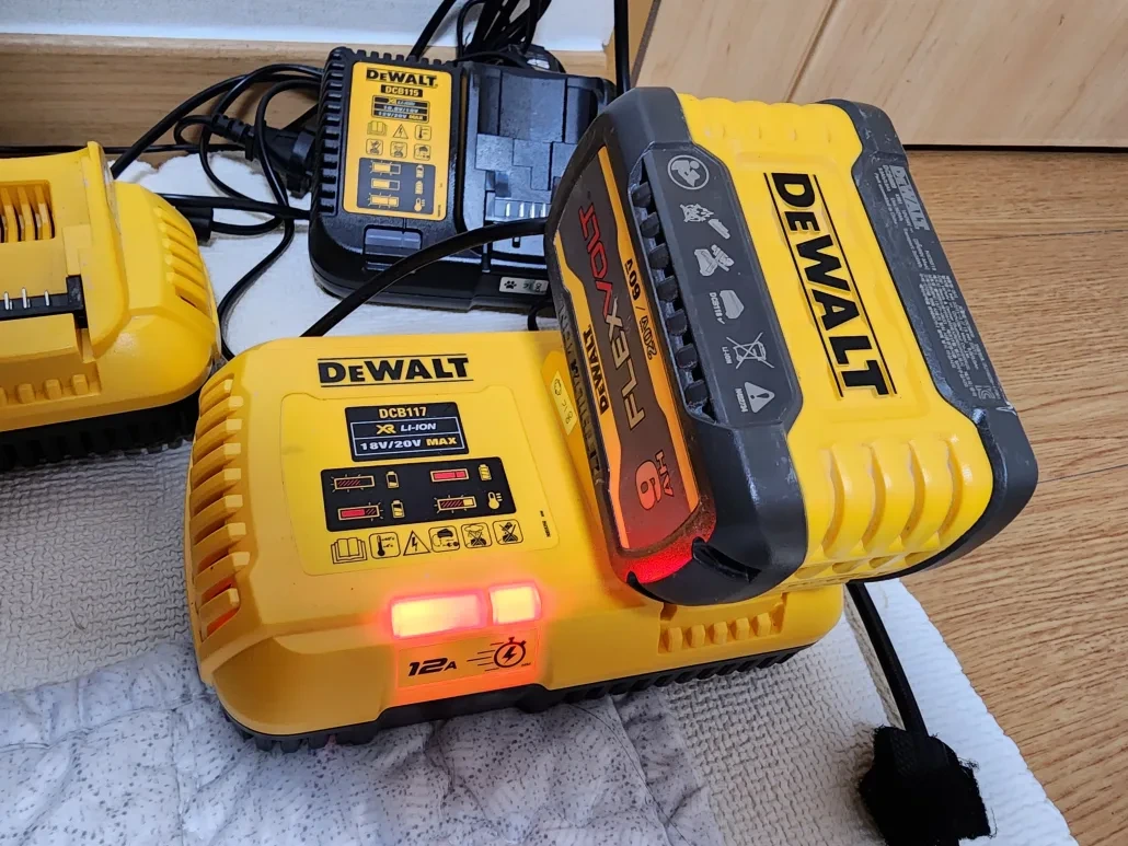 DCB609 플렉스볼트 배터리를 실제로 보신분은 아시겠지만 크기가 꽤 큽니다. 뒤에 보이는 디월트 충전기 DCB115와 비교하면서 보셔도 아시겠지만 디월트 충전기 DCB117이 상당히 큰편인데도 불구하고 커보이지가 않네요.