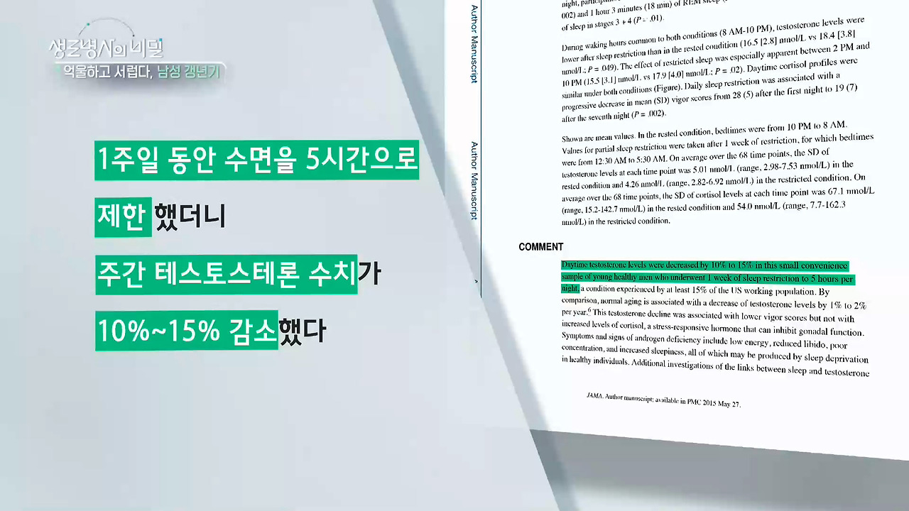 매년 1~2% 감소하는 테스토스테론수치가 1주일동안 수면을 5시간으로 제한 했더니 1주일 10%~15% 감소 - 수면감소 -> 스트레스호르몬 코르티솔 증가 -> LH 호르몬 저하 -> 남성호르몬 감소
