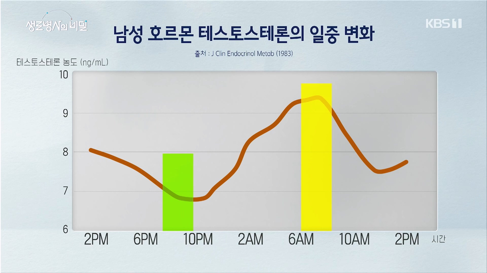 - 남성호르몬 테스토스테론의 일중변화 (출처:J Clin Endocrinol Metab 1983) : 밤 10시에 가장 낮고, 오전 6시~8시 사이 가장 높다.