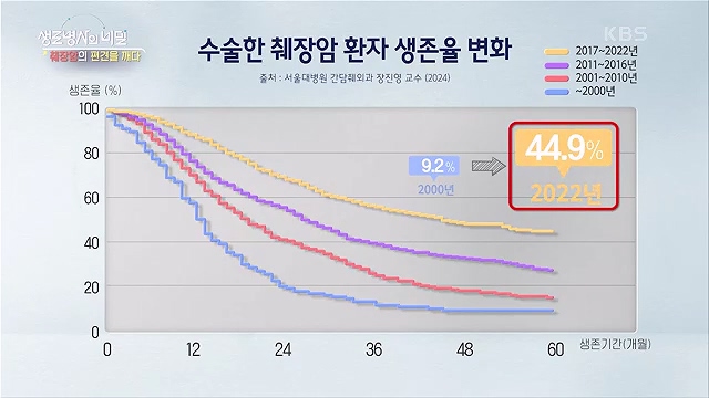 - 수술한 췌장암 환자 생존율 변화(출처:서울대병원 간담췌외과 장진영 교수 2024) : 2000년 9.2%=> 2022년 44.9%