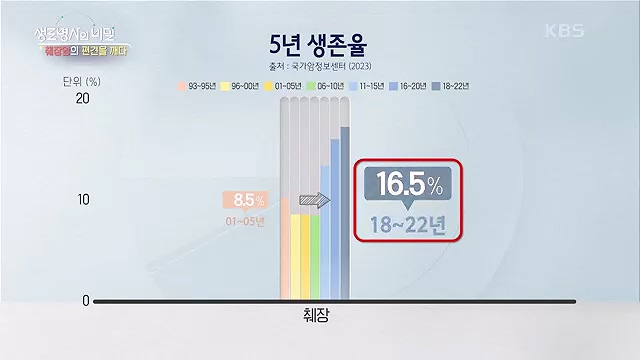 5년 생존율 꾸준히 증가세 : 01~05년 8.5% => 18~22년 16.5%