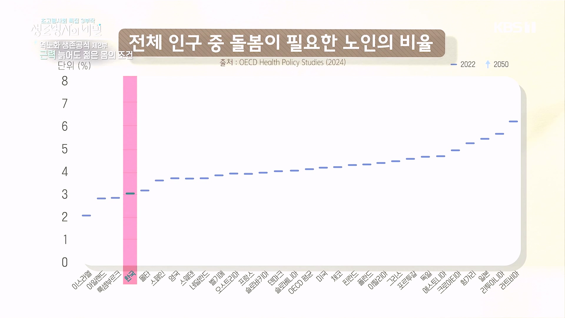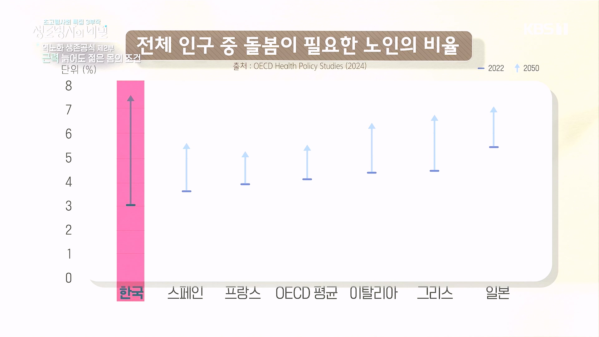 - 2022년 한국에서 돌봄이 필요한 인구는 3% => 2050년 가장높게 상승해 8%에 이를 것으로 보여진다. (출처: OECD Health Policy Studies 2024)