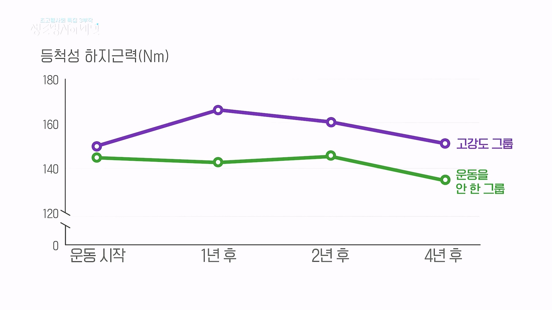 고강도 근력운동, 중강도 운동, 운동하지않은 대조군으로 나누어서 연구 운동을 한경우 4년간 근력이 유지되었다.