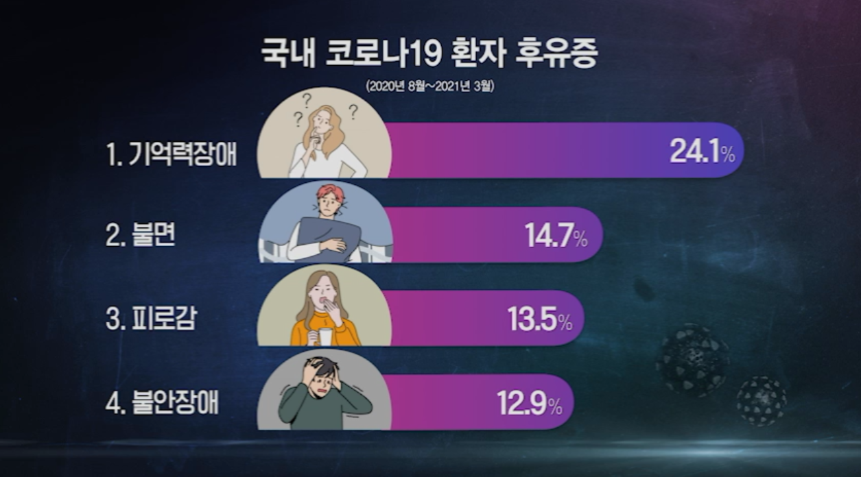 경북대학병원 감염내과 김신우 교수는 질병관리청과 공동연구를 통해 국내 최초 롱코비드 관련 논문을 발표했다. 해당 논문을 살펴보면 국내 롱코비드 환자가 호소하는 증상 1위는 기억력장애, 2위는 불안, 3위는 피로감, 4위는 불안장애로 신경ㆍ정신과적 증상이 상위권에 집계되었다. 앞서 언급한 사회적ㆍ정신적 롱코비드 상태가 통계로도 확인되었음을 알 수 있다.