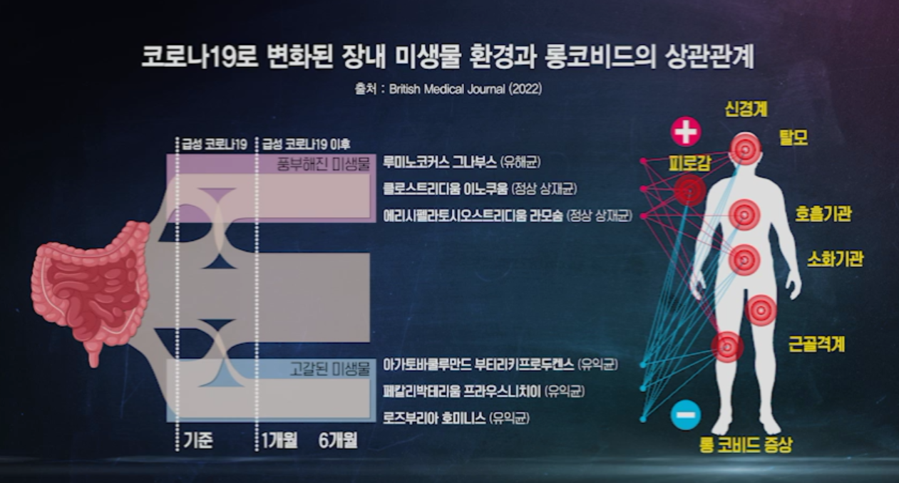 한림대강남성심병원 소화기내과 오창교 교수는 코로나19 바이러스에 감염되면 장내 미생물 환경에 큰 변화가 생긴다고 설명했다. 브리티시 메디컬 저널(BMJ)에서 발표한 논문에 따르면 소화기 장애를 호소하는 롱코비드 환자의 경우 장내 미생물 중 유익균의 다양성과 풍부도는 감소하고, 유해균의 다양성과 풍부도는 증가했다. 오창교 교수는 코로나19로 인한 장내 미생물 변화가 소화기 장애를 일으켰을 것으로 추정했다.