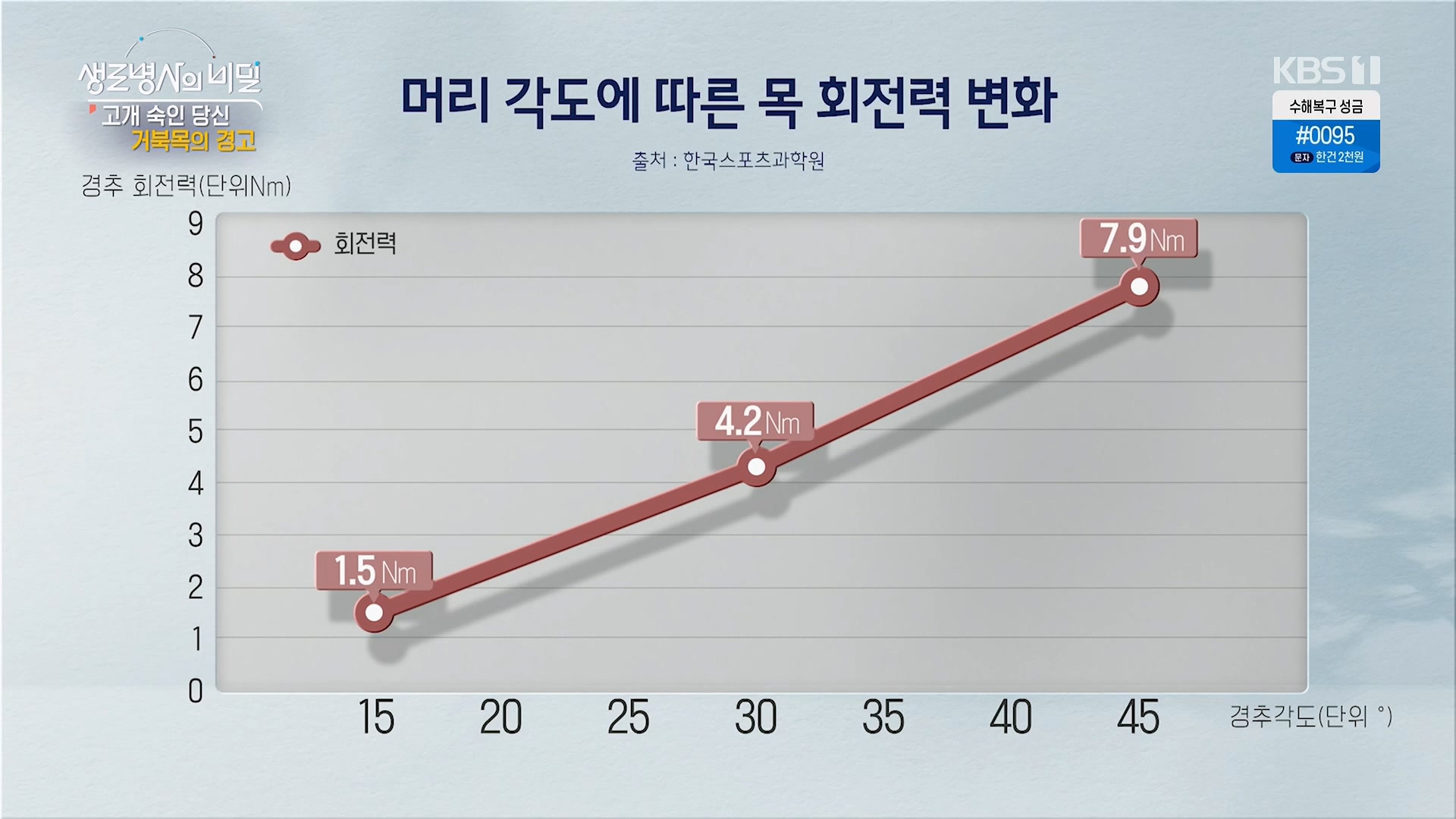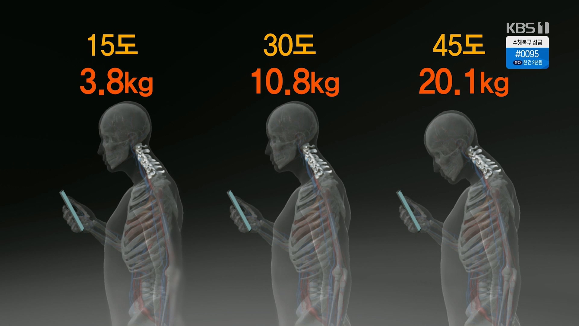 - 45도 숙였을때 20.1kg 무게를 목뼈에서 부담, 머리무게까지 포함하면 25kg 부담