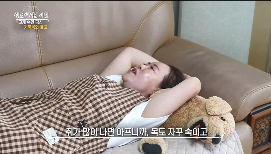 전업주부인 문명순(54) 씨는 통증 없이 깊게 잠드는 게 소원이다. 설거지하는 짧은 시간에도 수없이 소파에 누웠다 일어나기를 반복할 정도로 고통이 심하다는데... 명순 씨가 목에 통증을 느끼기 시작한 건 약 10년 전. 이후 손가락 저림과 등에 쥐가 나는 현상이 점점 심해지면서 일상 자체가 힘들어졌고 결국 수술을 앞두고 있다. 온몸에 저림 증상과 손 감각에 이상이 생긴 김주연(48) 씨도 목 디스크 수술이 필요한 상황이다. 때문에 다니던 일까지 그만둬야 했다. 명순 씨와 주연 씨, 두 사람 모두 검사 결과, 목뼈가 정상적인 ‘C’자 형태가 아닌 ‘일’자 및 역‘C’자 형태로 변형된, 거북목 상태였다.