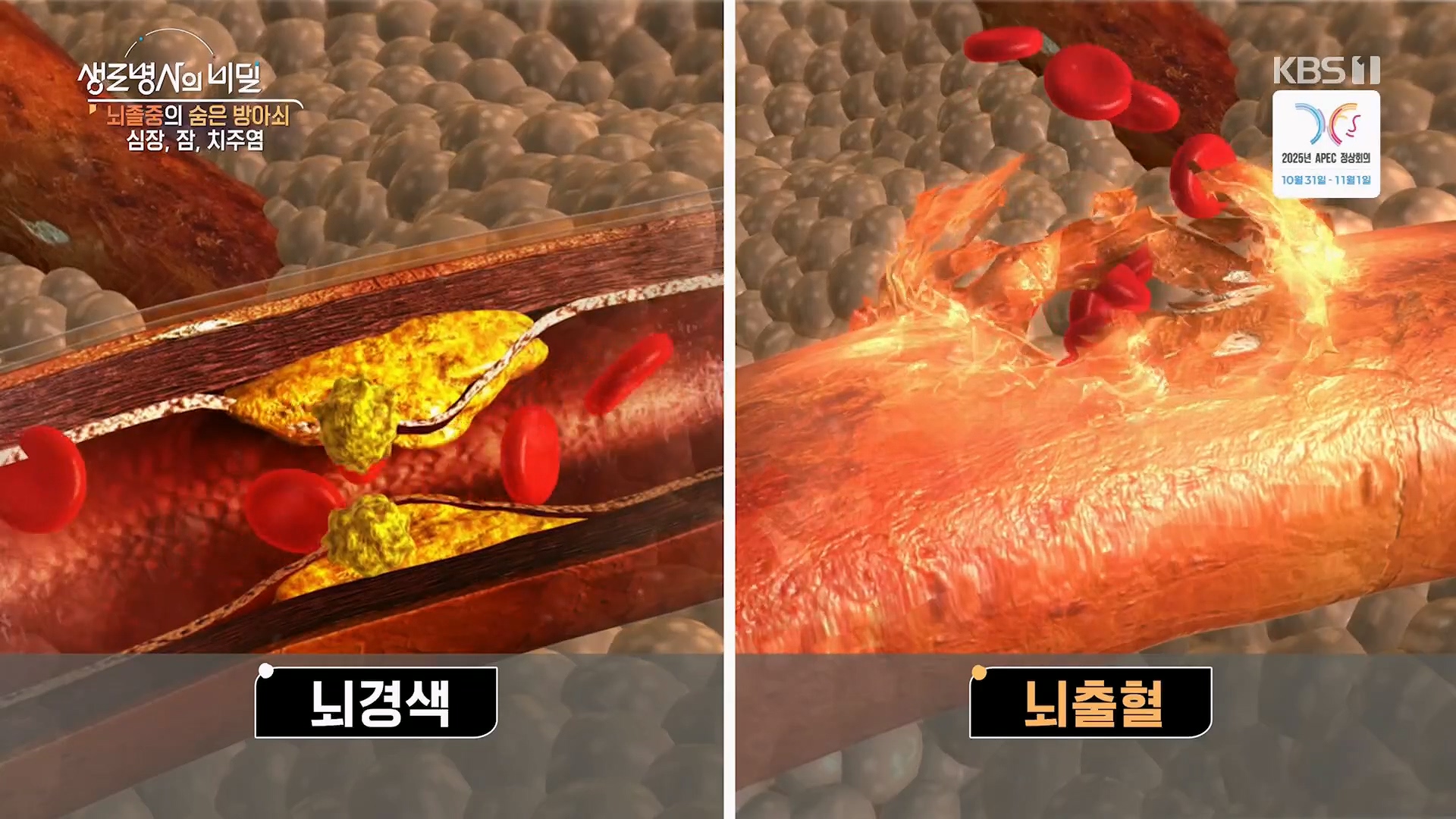 뇌졸중의 숨은 방아쇠 - 심장, 잠, 치주염* 방송일시 : 2025. 9. 24. (수) 밤 10시 KBS 1TV* 연출: 정갑수* 작가: 정진형뇌졸중은 뇌혈관에 이상이 생겨 발생하는 대표적인 뇌 질환으로, 뇌혈관이 막히는