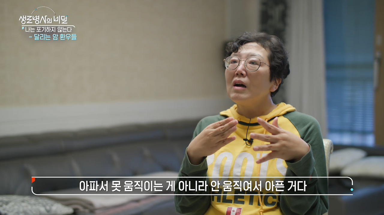 자궁내막암이 폐까지 전이되어 수술조차 불가능한 4기 암을 앓았던 유현주(51) 씨. 병실에 누워만 있던 그녀는 어느 날 밤, “안 움직여서 아픈 것”이라는 깨달음을 얻고 걷기 시작했다. 현재 면역항암제 치료와 꾸준한 운동을 병행하며 놀라울 정도로 깨끗해진 CT 결과를 마주한 그녀. 미래의 나에게 부끄럽지 않기 위해 달린다는 그녀의 이야기를 들어본다.