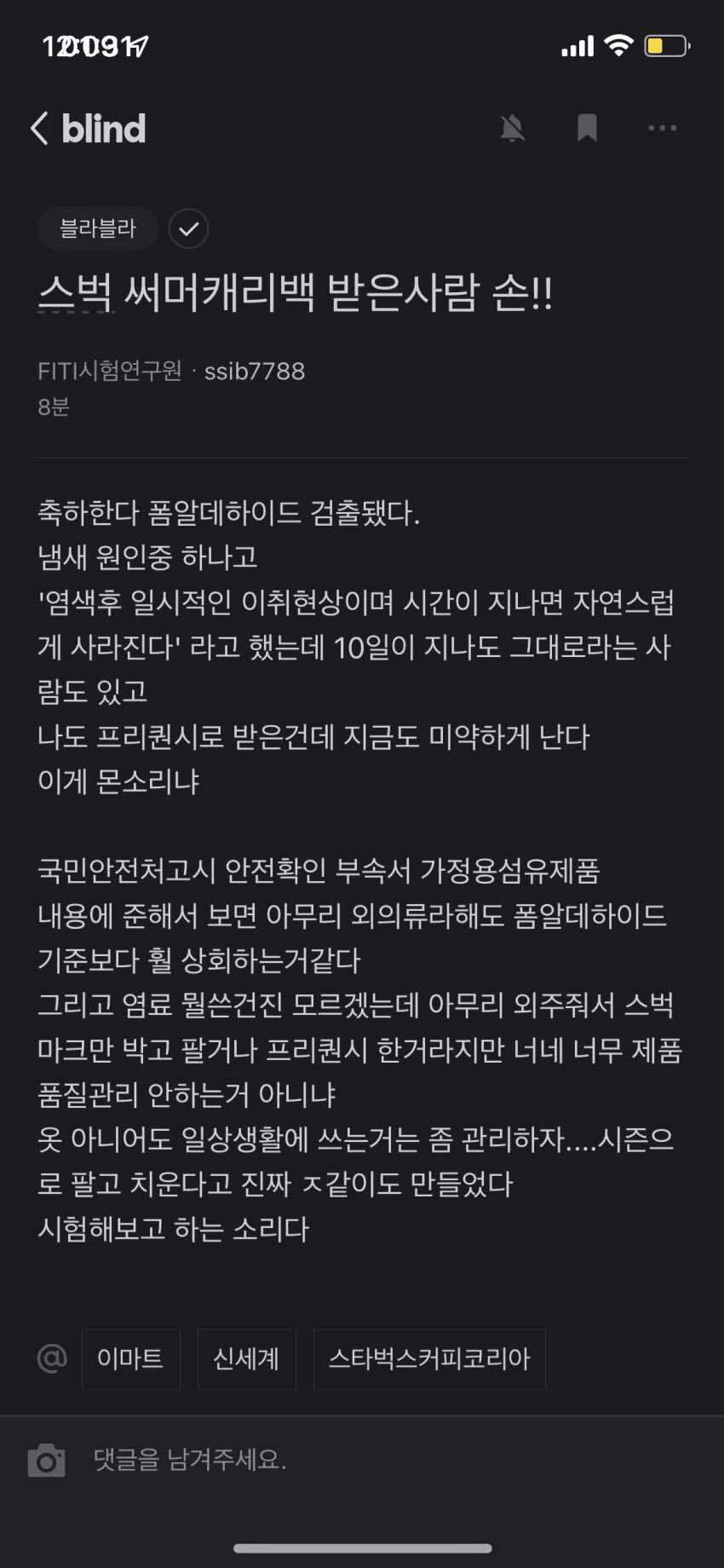 블라인드 FITI 시험연구원의 글 스타벅스 서머 캐리백 포름알데히드가 검출되었다고 해서 논란 저런거 오랫동안 냄새 안빠지면 ㅈ되는거라고 봐야하냐? ㅇ 휘발되도 남아있을 만큼 ㅈㄴ 많다는