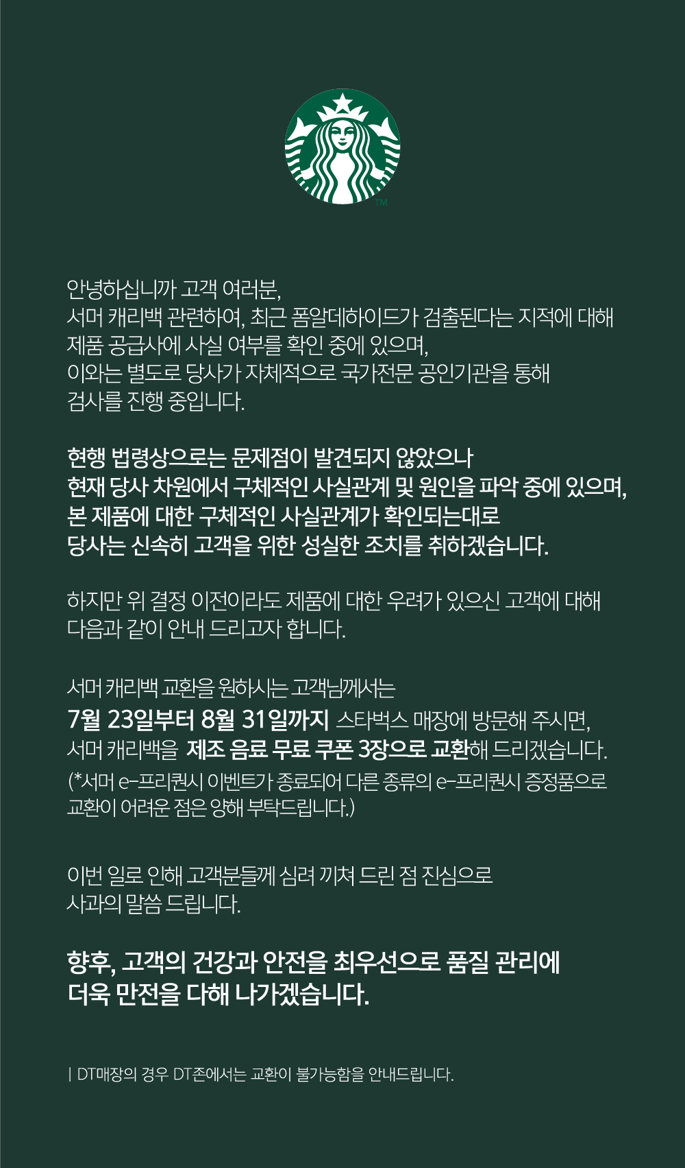 2022 스타벅스 서머 e-Frequency e-프리퀀시 서머캐리백 발암물질 사고에 따른 사과문 발표 3만원상